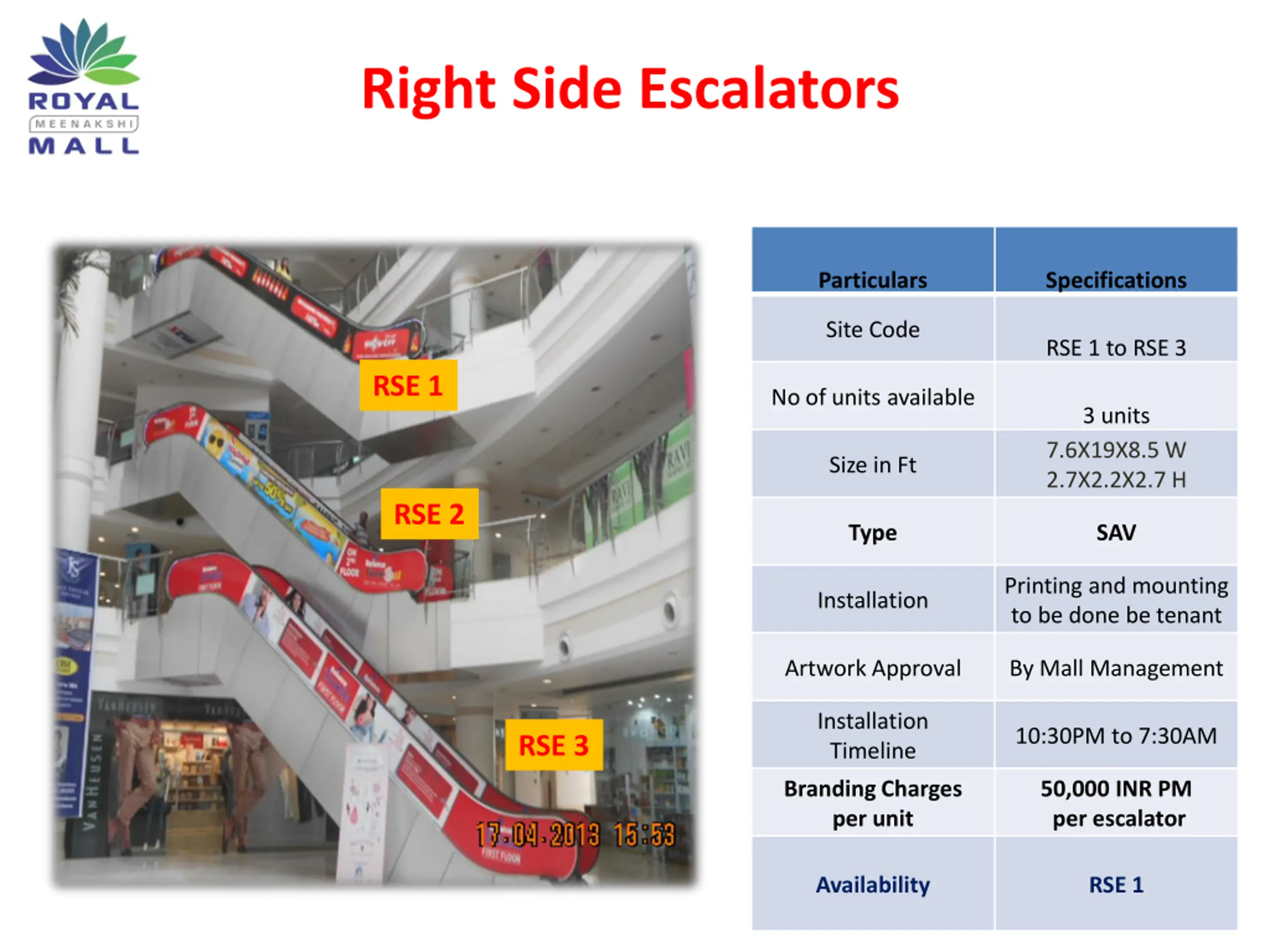 Right Side Escalators Particulars Specifications Site Code RSE 1 to RSE 3 RSE 1 No of units available 3 units 7.6X19X8.5 W 2.7X2.2X2.7 H Size in Ft RSE 2 Type SAV Printing and mounting to be done be tenant Installation Artwork Approval By Mall Management Installation Timeline 10:30PM to 7:30AM RSE 3 Branding Charges per unit 50,000 INR PM per escalator Availability RSE 1