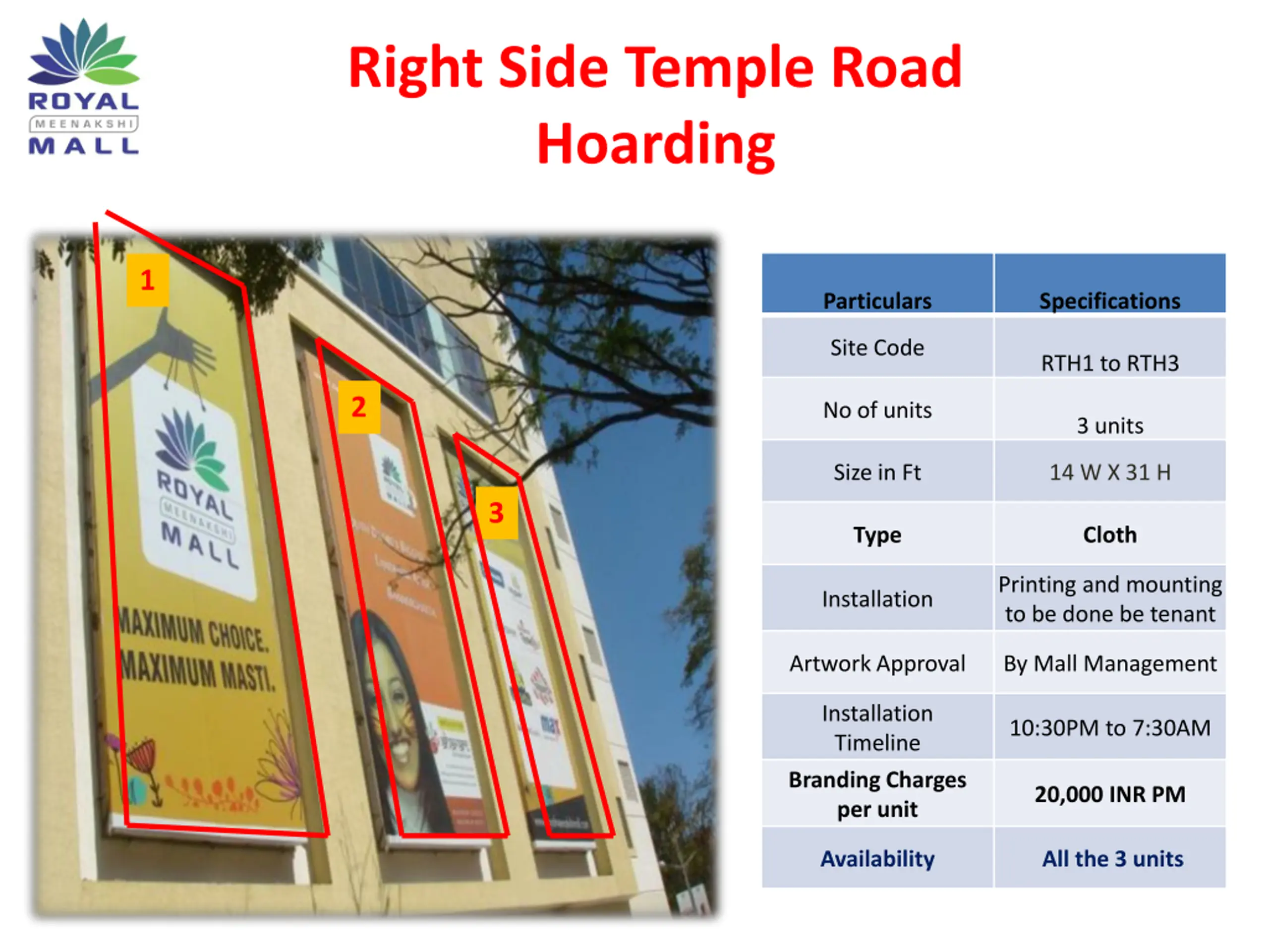 Right Side Temple Road Hoarding 1 Particulars Specifications Site Code RTH1 to RTH3 2 No of units 3 units Size in Ft 14 W X 31 H 3 Type Cloth Printing and mounting to be done be tenant Installation Artwork Approval By Mall Management Installation Timeline Branding Charges per unit 10:30PM to 7:30AM 20,000 INR PM Availability All the 3 units