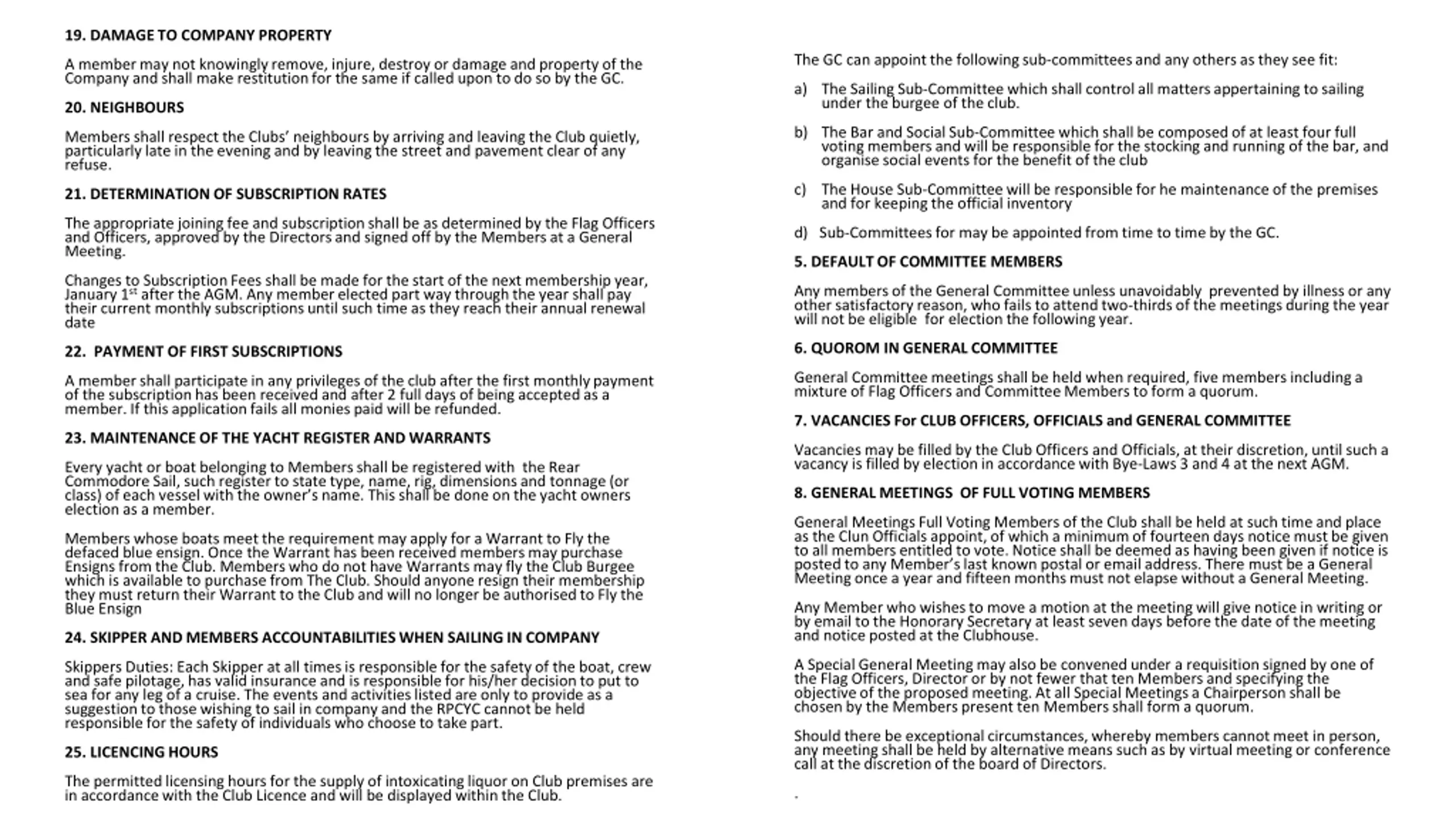 19. DAMAGE TO COMPANY PROPERTY The GC can appoint the following sub-committees and any others as they see fit: A member may not knowingly remove, injure, destroy or damage and property of the Company and shall make restitution for the same if called upon to do so by the GC. a) The Sailing Sub-Committee which shall control all matters appertaining to sailing under the burgee of the club. 20. NEIGHBOURS b) The Bar and Social Sub-Committee which shall be composed of at least four full voting members and will be responsible for the stocking and running of the bar, and organise social events for the benefit of the club Members shall respect the Clubs neighbours by arriving and leaving the Club quietly, particularly late in the evening and by leaving the street and pavement clear of any refuse. c) The House Sub-Committee will be responsible for he maintenance of the premises and for keeping the official inventory 21. DETERMINATION OF SUBSCRIPTION RATES The appropriate joining fee and subscription shall be as determined by the Flag Officers and Officers, approved by the Directors and signed off by the Members at a General Meeting. d) Sub-Committees for may be appointed from time to time by the GC. 5. DEFAULT OF COMMITTEE MEMBERS Changes to Subscription Fees shall be made for the start of the next membership year, January 1stafter the AGM. Any member elected part way through the year shall pay their current monthly subscriptions until such time as they reach their annual renewal date Any members of the General Committee unless unavoidably prevented by illness or any other satisfactory reason, who fails to attend two-thirds of the meetings during the year will not be eligible for election the following year. 6. QUOROM IN GENERAL COMMITTEE 22. PAYMENT OF FIRST SUBSCRIPTIONS General Committee meetings shall be held when required, five members including a mixture of Flag Officers and Committee Members to form a quorum. A member shall participate in any privileges of the club after the first monthly payment of the subscription has been received and after 2 full days of being accepted as a member. If this application fails all monies paid will be refunded. 7. VACANCIES For CLUB OFFICERS, OFFICIALS and GENERAL COMMITTEE 23. MAINTENANCE OF THE YACHT REGISTER AND WARRANTS Vacancies may be filled by the Club Officers and Officials, at their discretion, until such a vacancy is filled by election in accordance with Bye-Laws 3 and 4 at the next AGM. Every yacht or boat belonging to Members shall be registered with the Rear Commodore Sail, such register to state type, name, rig, dimensions and tonnage (or class) of each vessel with the owner s name. This shall be done on the yacht owners election as a member. 8. GENERAL MEETINGS OF FULL VOTING MEMBERS General Meetings Full Voting Members of the Club shall be held at such time and place as the Clun Officials appoint, of which a minimum of fourteen days notice must be given to all members entitled to vote. Notice shall be deemed as having been given if notice is posted to any Member s last known postal or email address. There must be a General Meeting once a year and fifteen months must not elapse without a General Meeting. Members whose boats meet the requirement may apply for a Warrant to Fly the defaced blue ensign. Once the Warrant has been received members may purchase Ensigns from the Club. Members who do not have Warrants may fly the Club Burgee which is available to purchase from The Club. Should anyone resign their membership they must return their Warrant to the Club and will no longer be authorised to Fly the Blue Ensign Any Member who wishes to move a motion at the meeting will give notice in writing or by email to the Honorary Secretary at least seven days before the date of the meeting and notice posted at the Clubhouse. 24. SKIPPER AND MEMBERS ACCOUNTABILITIES WHEN SAILING IN COMPANY A Special General Meeting may also be convened under a requisition signed by one of the Flag Officers, Director or by not fewer that ten Members and specifying the objective of the proposed meeting. At all Special Meetings a Chairperson shall be chosen by the Members present ten Members shall form a quorum. Skippers Duties: Each Skipper at all times is responsible for the safety of the boat, crew and safe pilotage, has valid insurance and is responsible for his/her decision to put to sea for any leg of a cruise. The events and activities listed are only to provide as a suggestion to those wishing to sail in company and the RPCYC cannot be held responsible for the safety of individuals who choose to take part. Should there be exceptional circumstances, whereby members cannot meet in person, any meeting shall be held by alternative means such as by virtual meeting or conference call at the discretion of the board of Directors. 25. LICENCING HOURS The permitted licensing hours for the supply of intoxicating liquor on Club premises are in accordance with the Club Licence and will be displayed within the Club. .