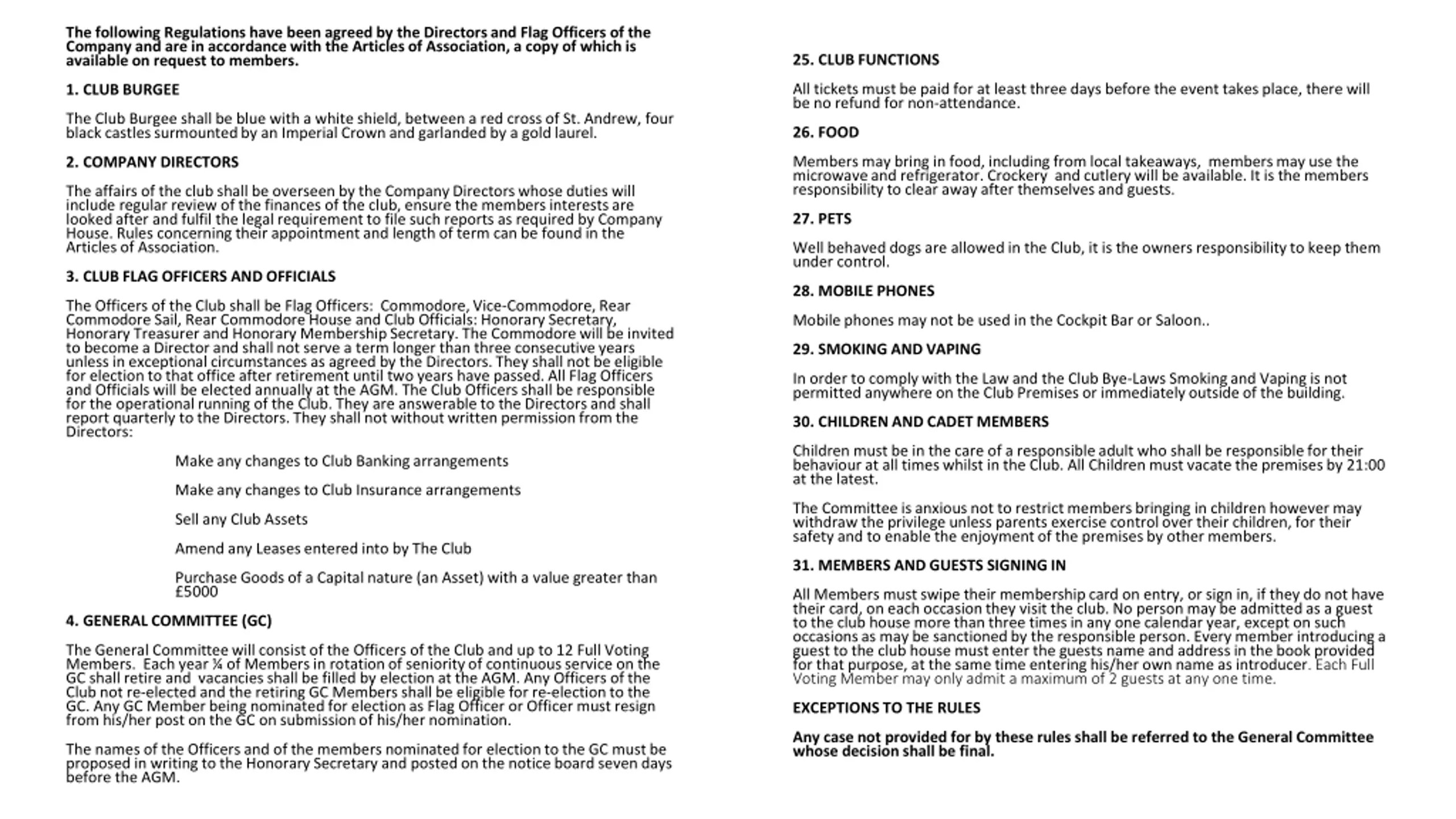 The following Regulations have been agreed by the Directors and Flag Officers of the Company and are in accordance with the Articles of Association, a copy of which is available on request to members. 25. CLUB FUNCTIONS All tickets must be paid for at least three days before the event takes place, there will be no refund for non-attendance. 1. CLUB BURGEE The Club Burgee shall be blue with a white shield, between a red cross of St. Andrew, four black castles surmounted by an Imperial Crown and garlanded by a gold laurel. 26. FOOD Members may bring in food, including from local takeaways, members may use the microwave and refrigerator. Crockery and cutlery will be available. It is the members responsibility to clear away after themselves and guests. 2. COMPANY DIRECTORS The affairs of the club shall be overseen by the Company Directors whose duties will include regular review of the finances of the club, ensure the members interests are looked after and fulfil the legal requirement to file such reports as required by Company House. Rules concerning their appointment and length of term can be found in the Articles of Association. 27. PETS Well behaved dogs are allowed in the Club, it is the owners responsibility to keep them under control. 3. CLUB FLAG OFFICERS AND OFFICIALS 28. MOBILE PHONES The Officers of the Club shall be Flag Officers: Commodore, Vice-Commodore, Rear Commodore Sail, Rear Commodore House and Club Officials: Honorary Secretary, Honorary Treasurer and Honorary Membership Secretary. The Commodore will be invited to become a Director and shall not serve a term longer than three consecutive years unless in exceptional circumstances as agreed by the Directors. They shall not be eligible for election to that office after retirement until two years have passed. All Flag Officers and Officials will be elected annually at the AGM. The Club Officers shall be responsible for the operational running of the Club. They are answerable to the Directors and shall report quarterly to the Directors. They shall not without written permission from the Directors: Mobile phones may not be used in the Cockpit Bar or Saloon.. 29. SMOKING AND VAPING In order to comply with the Law and the Club Bye-Laws Smoking and Vaping is not permitted anywhere on the Club Premises or immediately outside of the building. 30. CHILDREN AND CADET MEMBERS Children must be in the care of a responsible adult who shall be responsible for their behaviour at all times whilst in the Club. All Children must vacate the premises by 21:00 at the latest. Make any changes to Club Banking arrangements Make any changes to Club Insurance arrangements The Committee is anxious not to restrict members bringing in children however may withdraw the privilege unless parents exercise control over their children, for their safety and to enable the enjoyment of the premises by other members. Sell any Club Assets Amend any Leases entered into by The Club 31. MEMBERS AND GUESTS SIGNING IN Purchase Goods of a Capital nature (an Asset) with a value greater than 5000 All Members must swipe their membership card on entry, or sign in, if they do not have their card, on each occasion they visit the club. No person may be admitted as a guest to the club house more than three times in any one calendar year, except on such occasions as may be sanctioned by the responsible person. Every member introducing a guest to the club house must enter the guests name and address in the book provided for that purpose, at the same time entering his/her own name as introducer. Each Full Voting Member may only admit a maximum of 2 guests at any one time. 4. GENERAL COMMITTEE (GC) The General Committee will consist of the Officers of the Club and up to 12 Full Voting Members. Each year of Members in rotation of seniority of continuous service on the GC shall retire and vacancies shall be filled by election at the AGM. Any Officers of the Club not re-elected and the retiring GC Members shall be eligible for re-election to the GC. Any GC Member being nominated for election as Flag Officer or Officer must resign from his/her post on the GC on submission of his/her nomination. EXCEPTIONS TO THE RULES Any case not provided for by these rules shall be referred to the General Committee whose decision shall be final. The names of the Officers and of the members nominated for election to the GC must be proposed in writing to the Honorary Secretary and posted on the notice board seven days before the AGM.