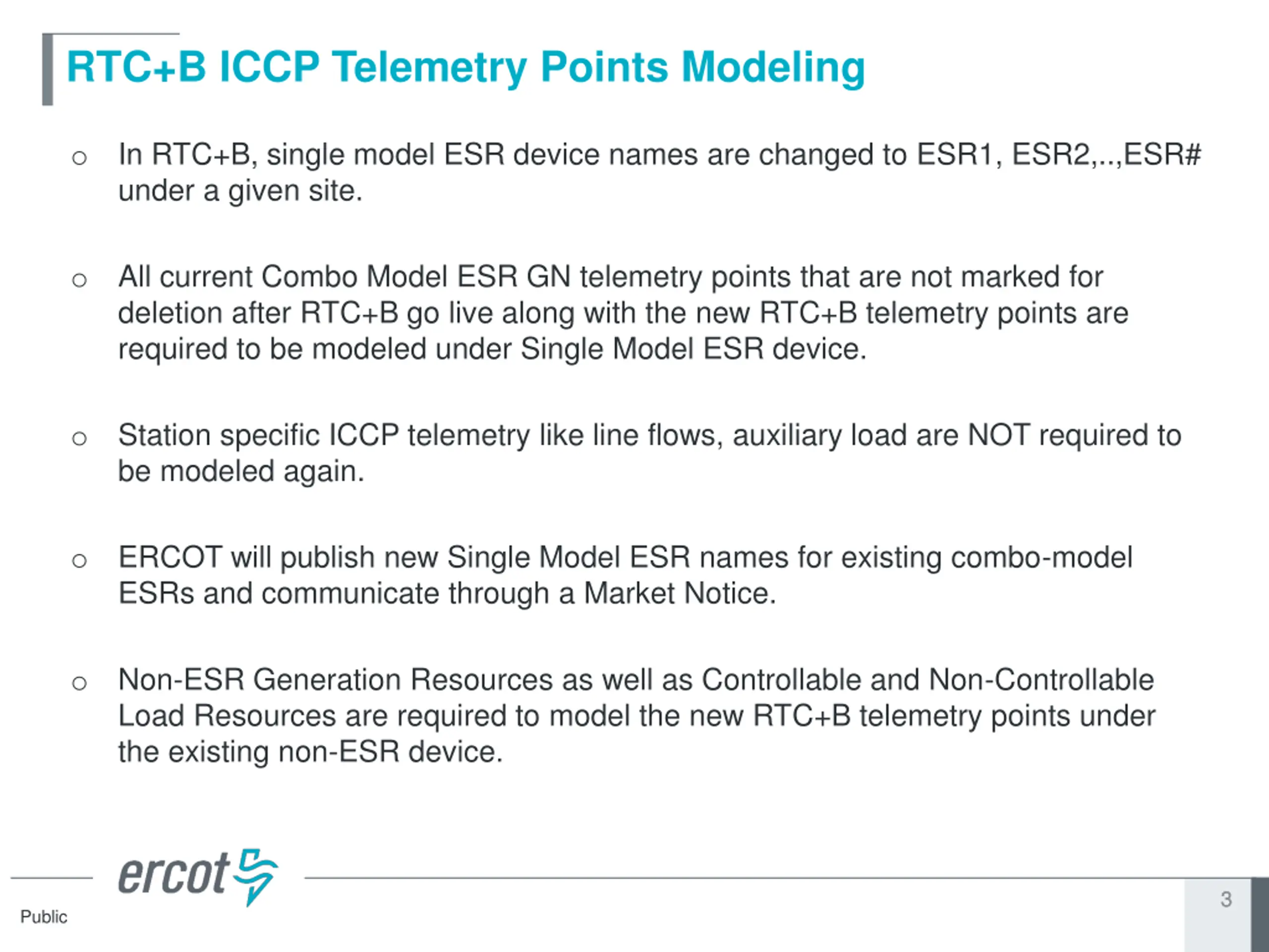 RTC+B ICCP Telemetry Points Modeling RTC+B ICCP Telemetry Model changes o QSEs to Submit new ICCP telemetry point requests o QSEs/ERCOT to maintain the new ICCP telemetry points for both current system and RTC+B system through weekly model loads. 2 2 Public