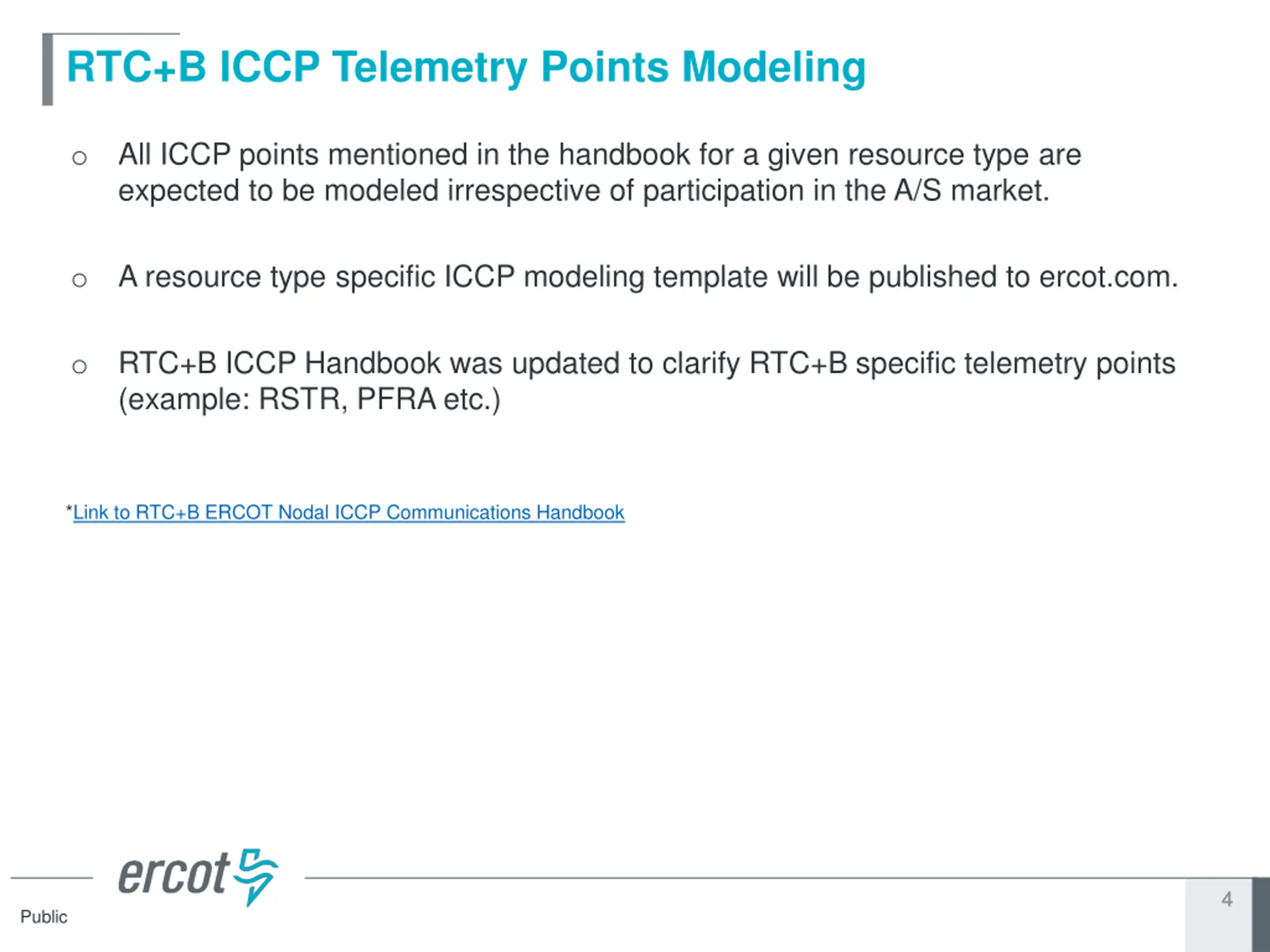 RTC+B ICCP Telemetry Points Modeling In RTC+B, single model ESR device names are changed to ESR1, ESR2,..,ESR# under a given site. o All current Combo Model ESR GN telemetry points that are not marked for deletion after RTC+B go live along with the new RTC+B telemetry points are required to be modeled under Single Model ESR device. o Station specific ICCP telemetry like line flows, auxiliary load are NOT required to be modeled again. o ERCOT will publish new Single Model ESR names for existing combo-model ESRs and communicate through a Market Notice. o Non-ESR Generation Resources as well as Controllable and Non-Controllable Load Resources are required to model the new RTC+B telemetry points under the existing non-ESR device. o 3 3 Public