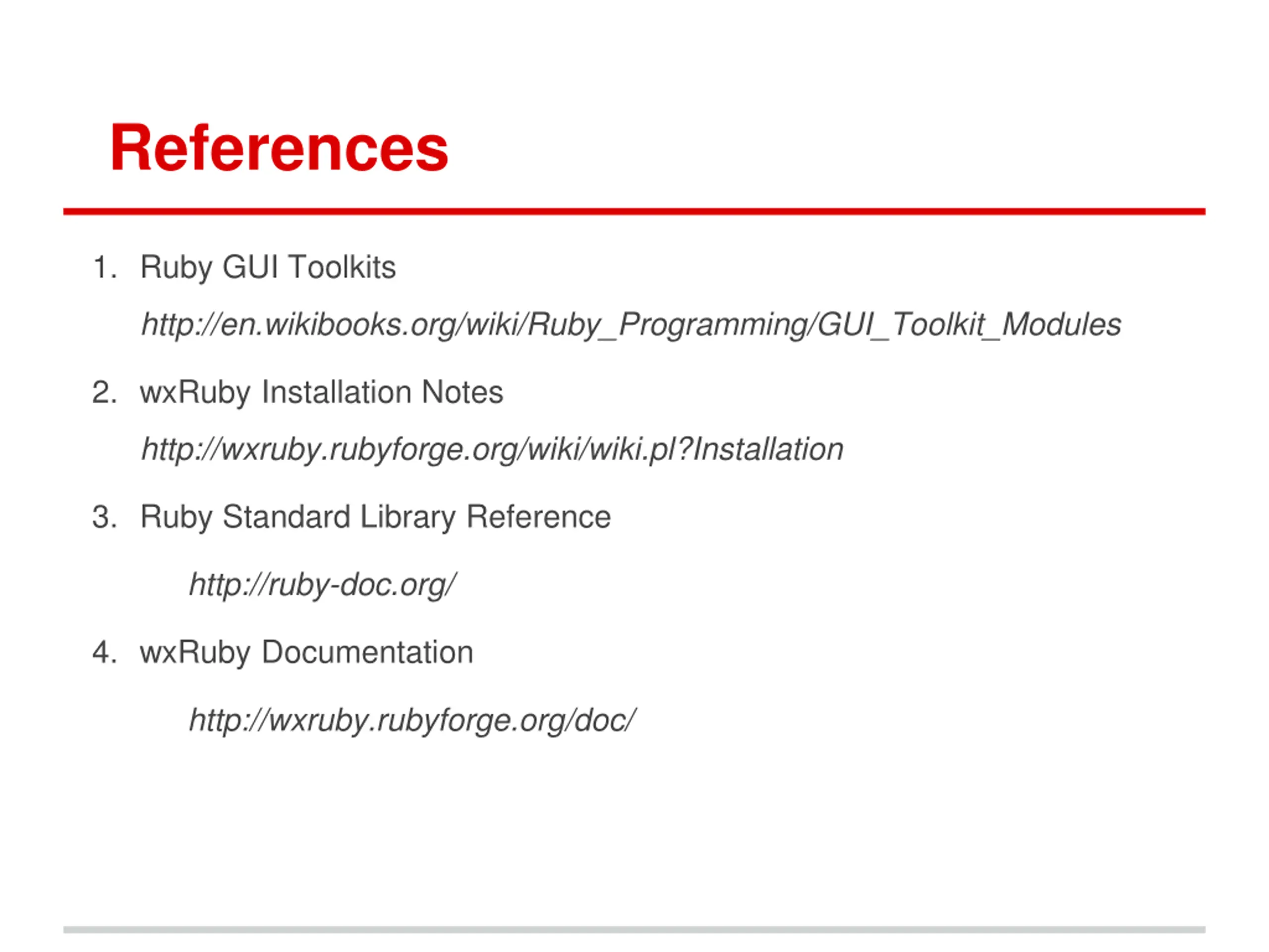 References 1. Ruby GUI Toolkits http://en.wikibooks.org/wiki/Ruby_Programming/GUI_Toolkit_Modules 2. wxRuby Installation Notes http://wxruby.rubyforge.org/wiki/wiki.pl?Installation 3. Ruby Standard Library Reference http://ruby-doc.org/ 4. wxRuby Documentation http://wxruby.rubyforge.org/doc/