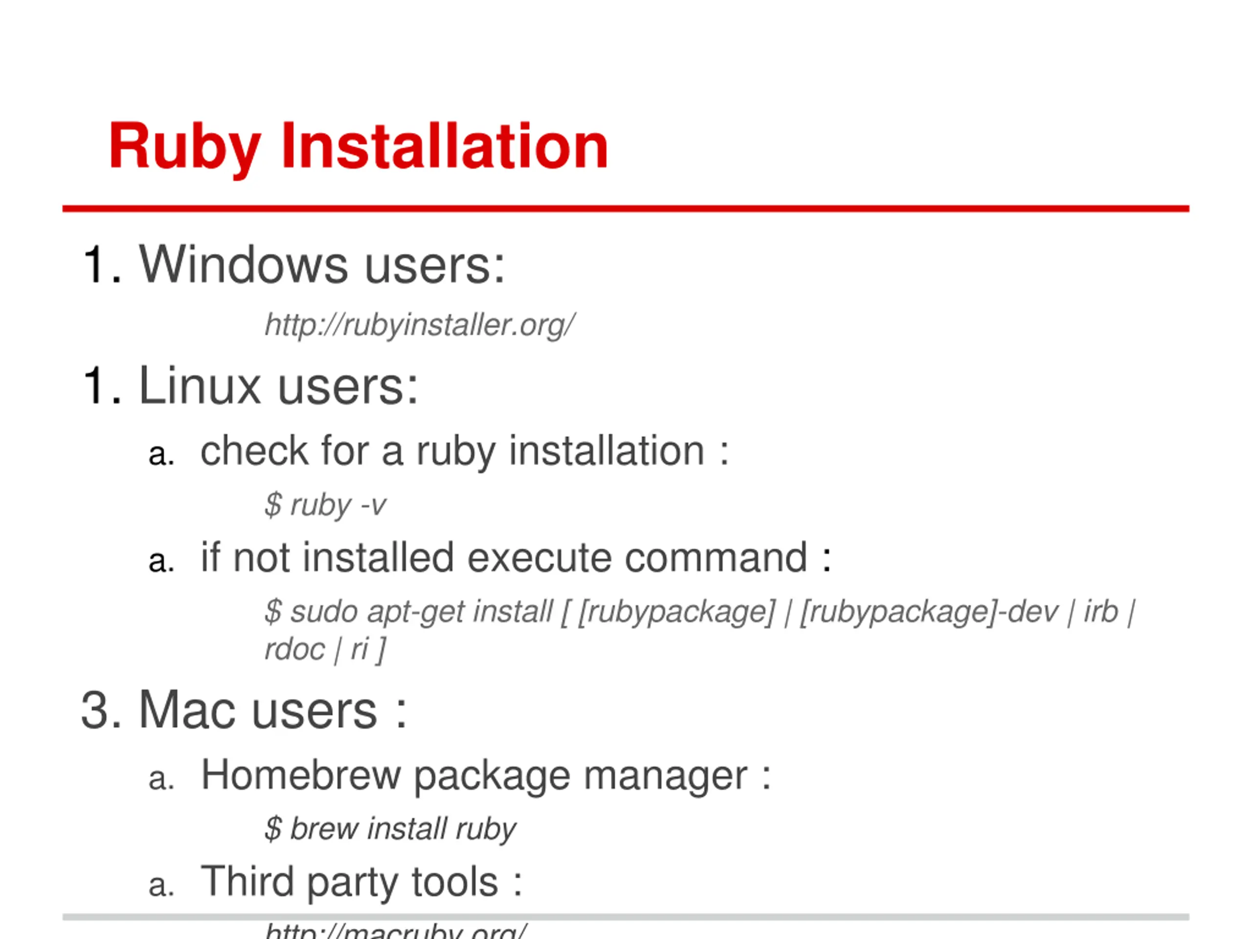 Ruby Installation 1. Windows users: http://rubyinstaller.org/ 1. Linux users: a. check for a ruby installation : $ ruby -v a. if not installed execute command : $ sudo apt-get install [ [rubypackage] | [rubypackage]-dev | irb | rdoc | ri ] 3. Mac users : a. Homebrew package manager : $ brew install ruby a. Third party tools : http://macruby.org/