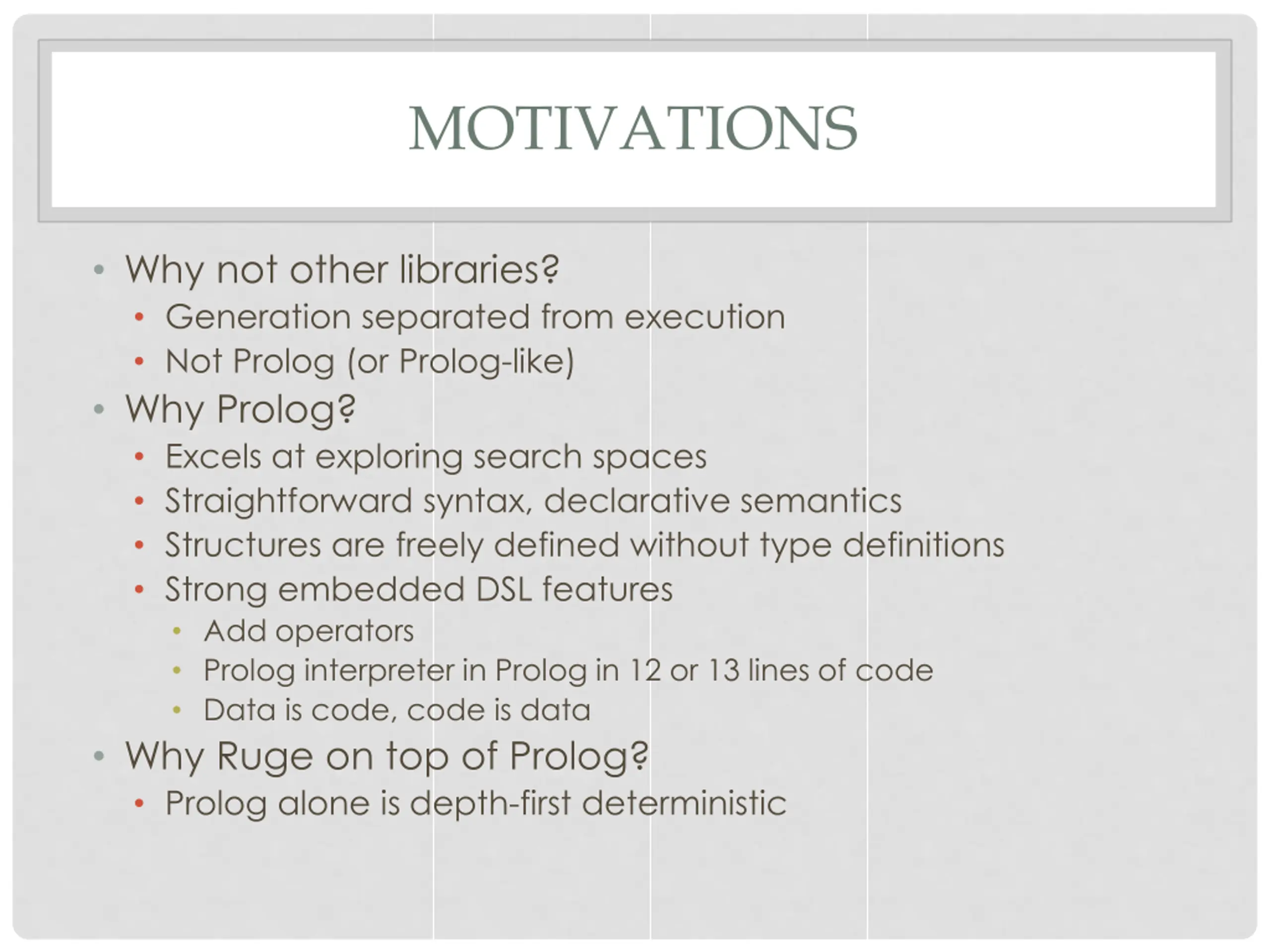 MOTIVATIONS Why not other libraries? Generation separated from execution Not Prolog (or Prolog-like) Why Prolog? Excels at exploring search spaces Straightforward syntax, declarative semantics Structures are freely defined without type definitions Strong embedded DSL features Add operators Prolog interpreter in Prolog in 12 or 13 lines of code Data is code, code is data Why Ruge on top of Prolog? Prolog alone is depth-first deterministic