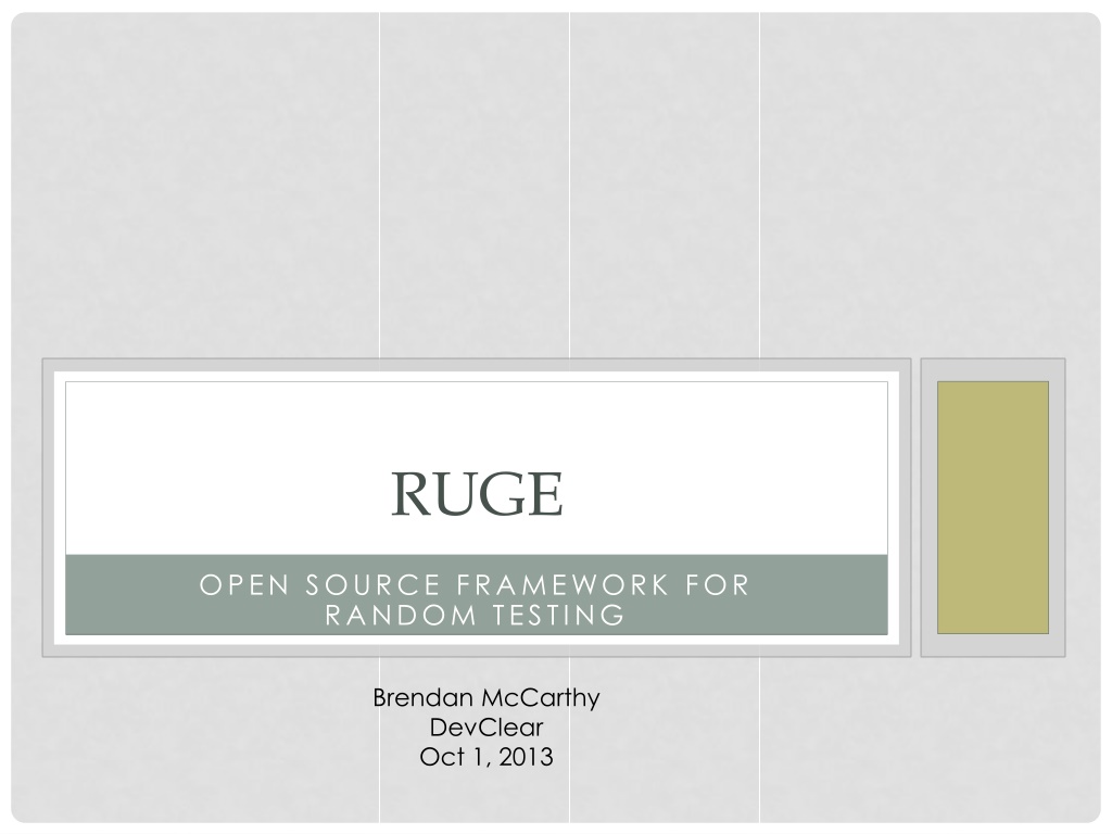 RUGE OPEN SOURCE FRAMEWORK FOR RANDOM TESTING Brendan McCarthy DevClear Oct 1, 2013