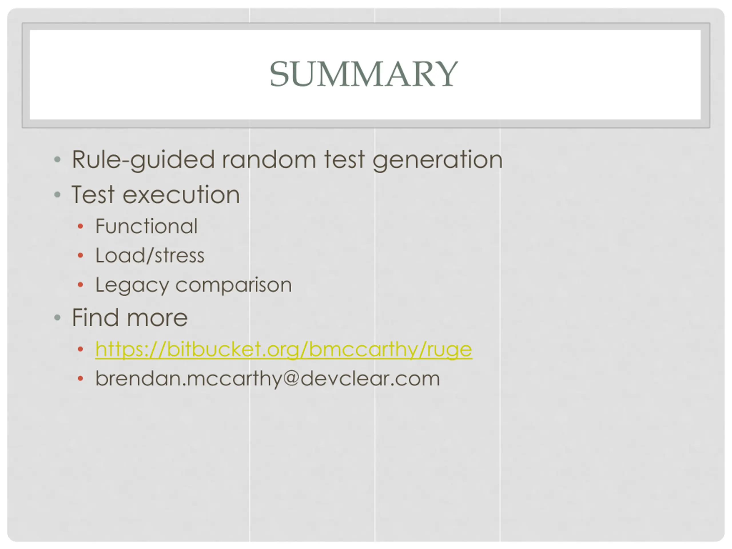 SUMMARY Rule-guided random test generation Test execution Functional Load/stress Legacy comparison Find more https://bitbucket.org/bmccarthy/ruge brendan.mccarthy@devclear.com
