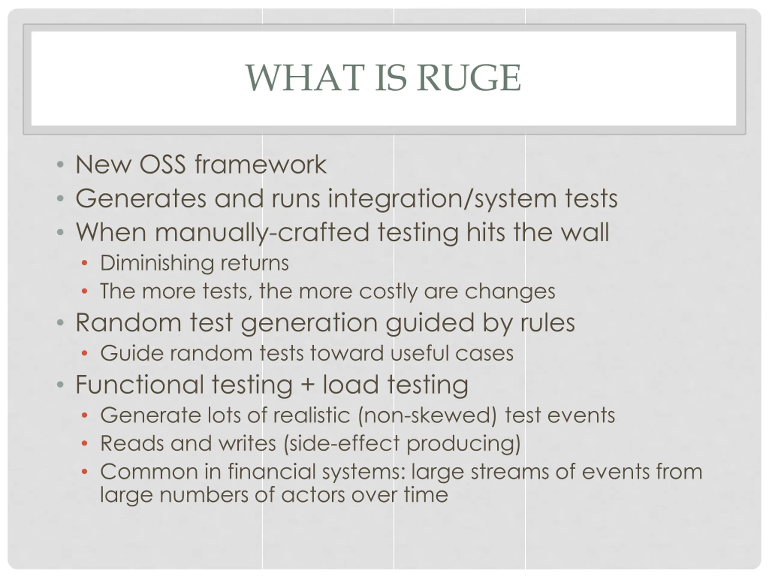 WHAT IS RUGE New OSS framework Generates and runs integration/system tests When manually-crafted testing hits the wall Diminishing returns The more tests, the more costly are changes Random test generation guided by rules Guide random tests toward useful cases Functional testing + load testing Generate lots of realistic (non-skewed) test events Reads and writes (side-effect producing) Common in financial systems: large streams of events from large numbers of actors over time
