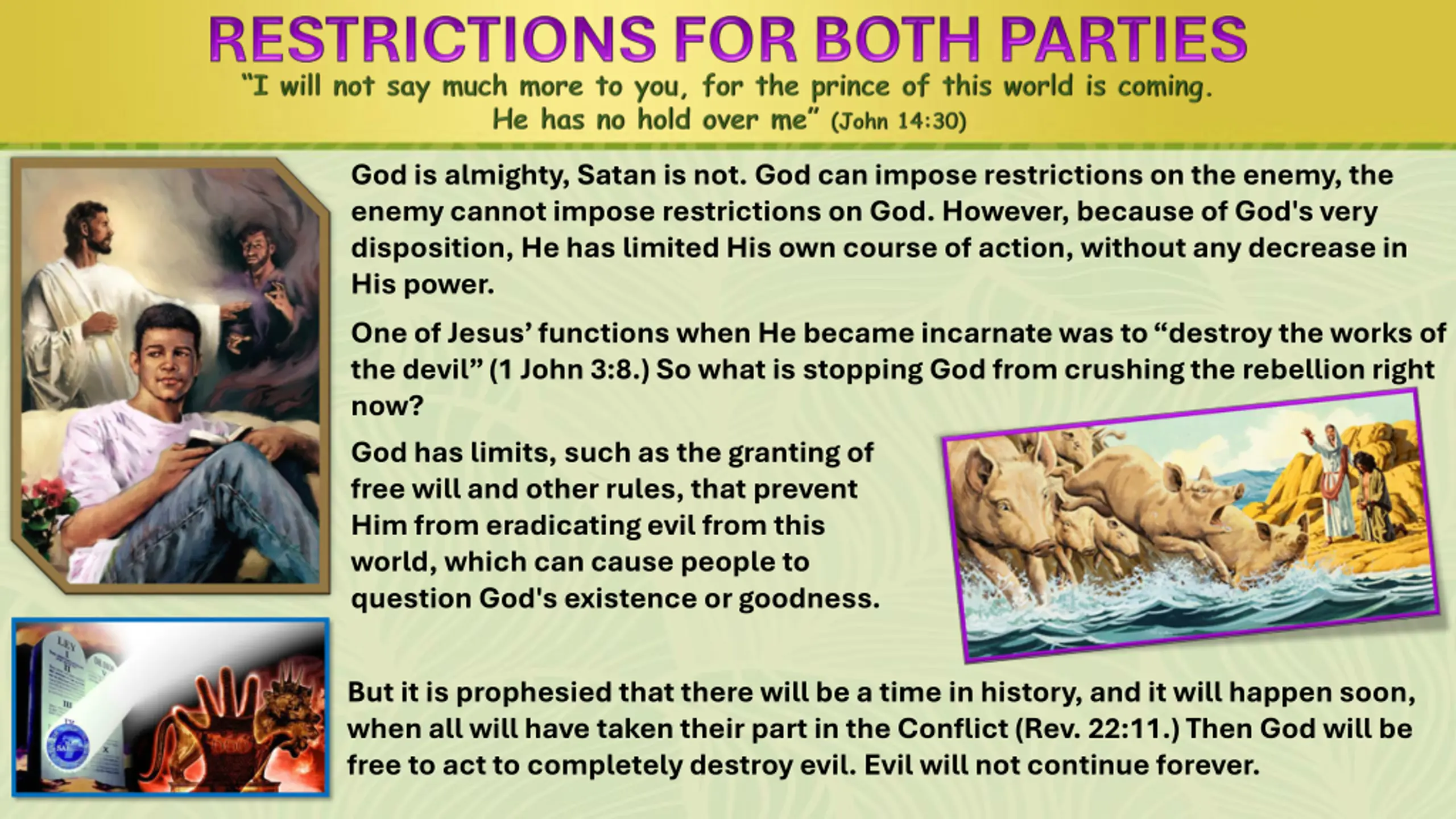 After the fall of Adam and Eve, God allowed Satan to rule this world, but He imposed certain rules and limitations on him. Although we do not know many of the rules of the Cosmic Conflict, God has given us some knowledge of the limits imposed on evil. He has also revealed to us some of the limits He has imposed on Himself in this Conflict. What are the rules that govern the Cosmic Conflict between God and Satan? The rules of Conflict: The god of this world. The Limits of Conflict: Time limits. Physical limits. The Weapons of Conflict: Restrictions for both parties. A weapon at our disposal.