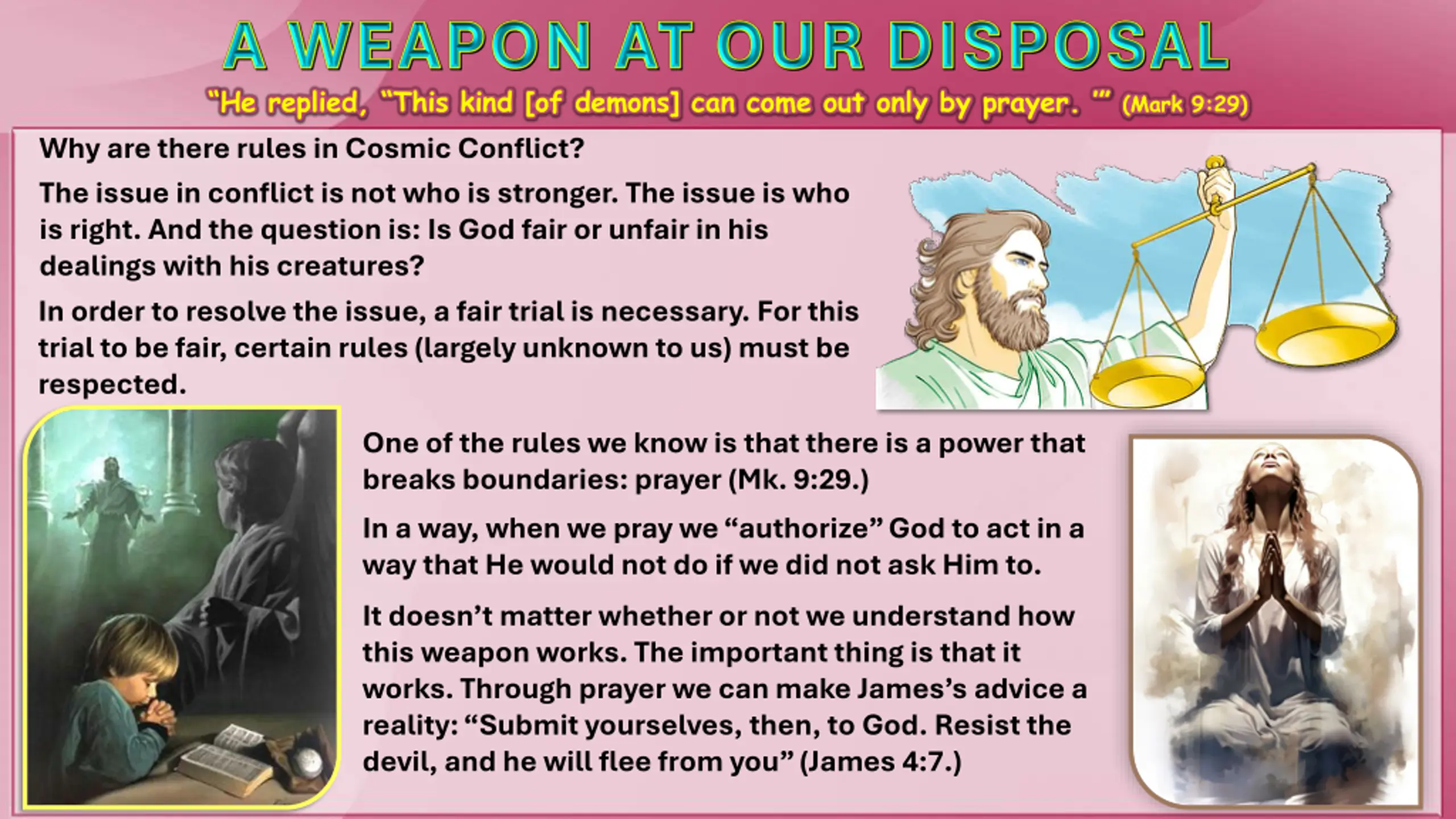 He replied, This kind [of demons] can come out only by prayer. (Mark 9:29) Why are there rules in Cosmic Conflict? The issue in conflict is not who is stronger. The issue is who is right. And the question is: Is God fair or unfair in his dealings with his creatures? In order to resolve the issue, a fair trial is necessary. For this trial to be fair, certain rules (largely unknown to us) must be respected. One of the rules we know is that there is a power that breaks boundaries: prayer (Mk. 9:29.) In a way, when we pray we authorize God to act in a way that He would not do if we did not ask Him to. It doesn t matter whether or not we understand how this weapon works. The important thing is that it works. Through prayer we can make James s advice a reality: Submit yourselves, then, to God. Resist the devil, and he will flee from you (James 4:7.)