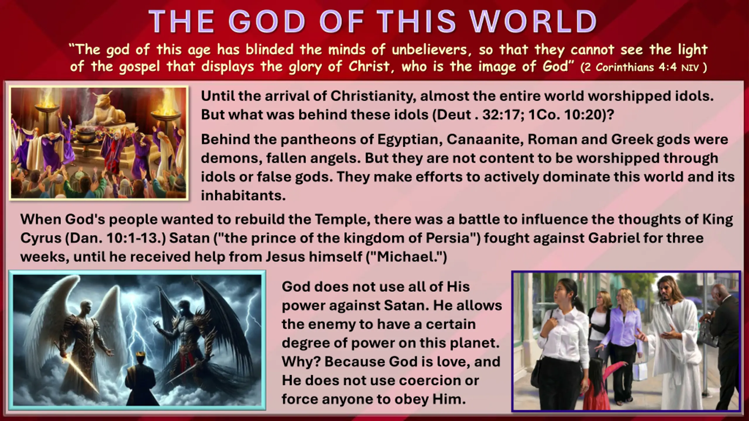 The god of this age has blinded the minds of unbelievers, so that they cannot see the light of the gospel that displays the glory of Christ, who is the image of God (2 Corinthians 4:4 NIV ) Until the arrival of Christianity, almost the entire world worshipped idols. But what was behind these idols (Deut . 32:17; 1Co. 10:20)? Behind the pantheons of Egyptian, Canaanite, Roman and Greek gods were demons, fallen angels. But they are not content to be worshipped through idols or false gods. They make efforts to actively dominate this world and its inhabitants. When God's people wanted to rebuild the Temple, there was a battle to influence the thoughts of King Cyrus (Dan. 10:1-13.) Satan ("the prince of the kingdom of Persia") fought against Gabriel for three weeks, until he received help from Jesus himself ("Michael.") God does not use all of His power against Satan. He allows the enemy to have a certain degree of power on this planet. Why? Because God is love, and He does not use coercion or force anyone to obey Him.