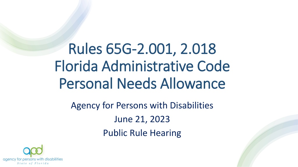 Rules 65G Rules 65G- -2.001, 2.018 2.001, 2.018 Florida Administrative Code Florida Administrative Code Personal Needs Allowance Personal Needs Allowance Agency for Persons with Disabilities June 21, 2023 Public Rule Hearing