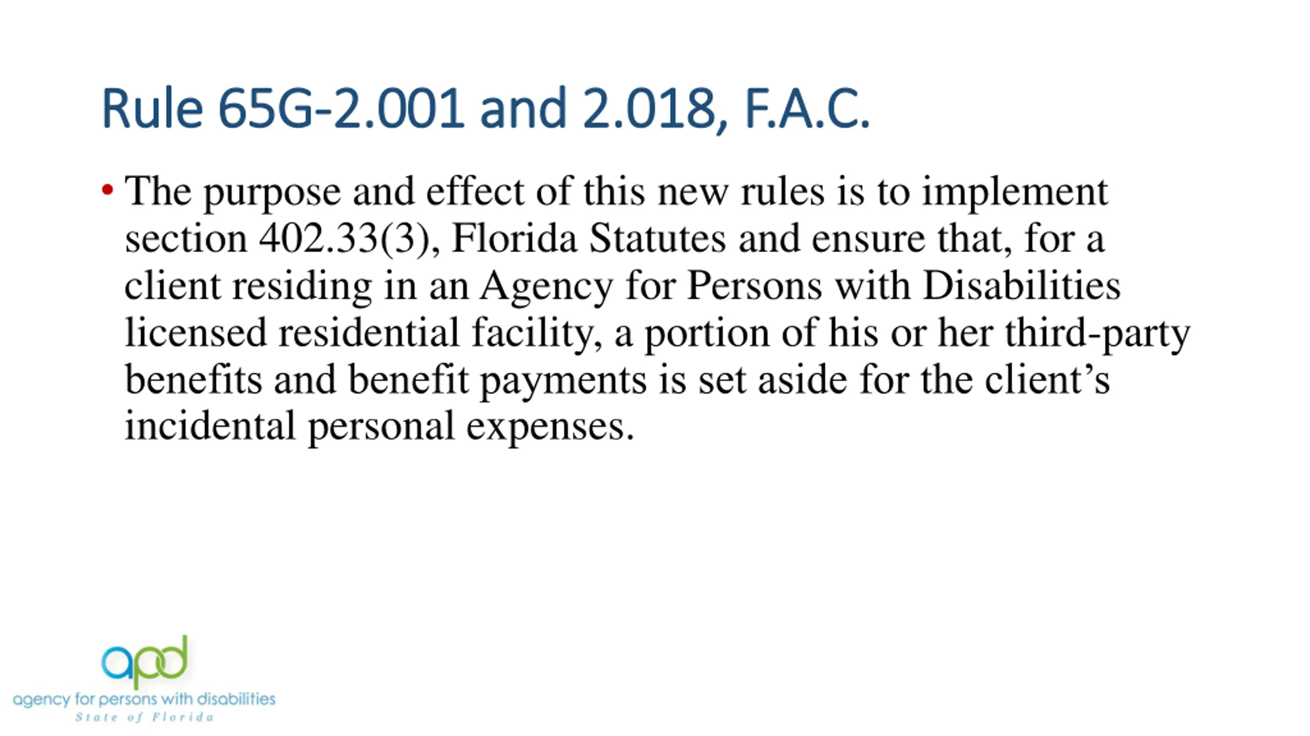 Rule 65G Rule 65G- -2.001 and 2.018, F.A.C. 2.001 and 2.018, F.A.C. The purpose and effect of this new rules is to implement section 402.33(3), Florida Statutes and ensure that, for a client residing in an Agency for Persons with Disabilities licensed residential facility, a portion of his or her third-party benefits and benefit payments is set aside for the client s incidental personal expenses.