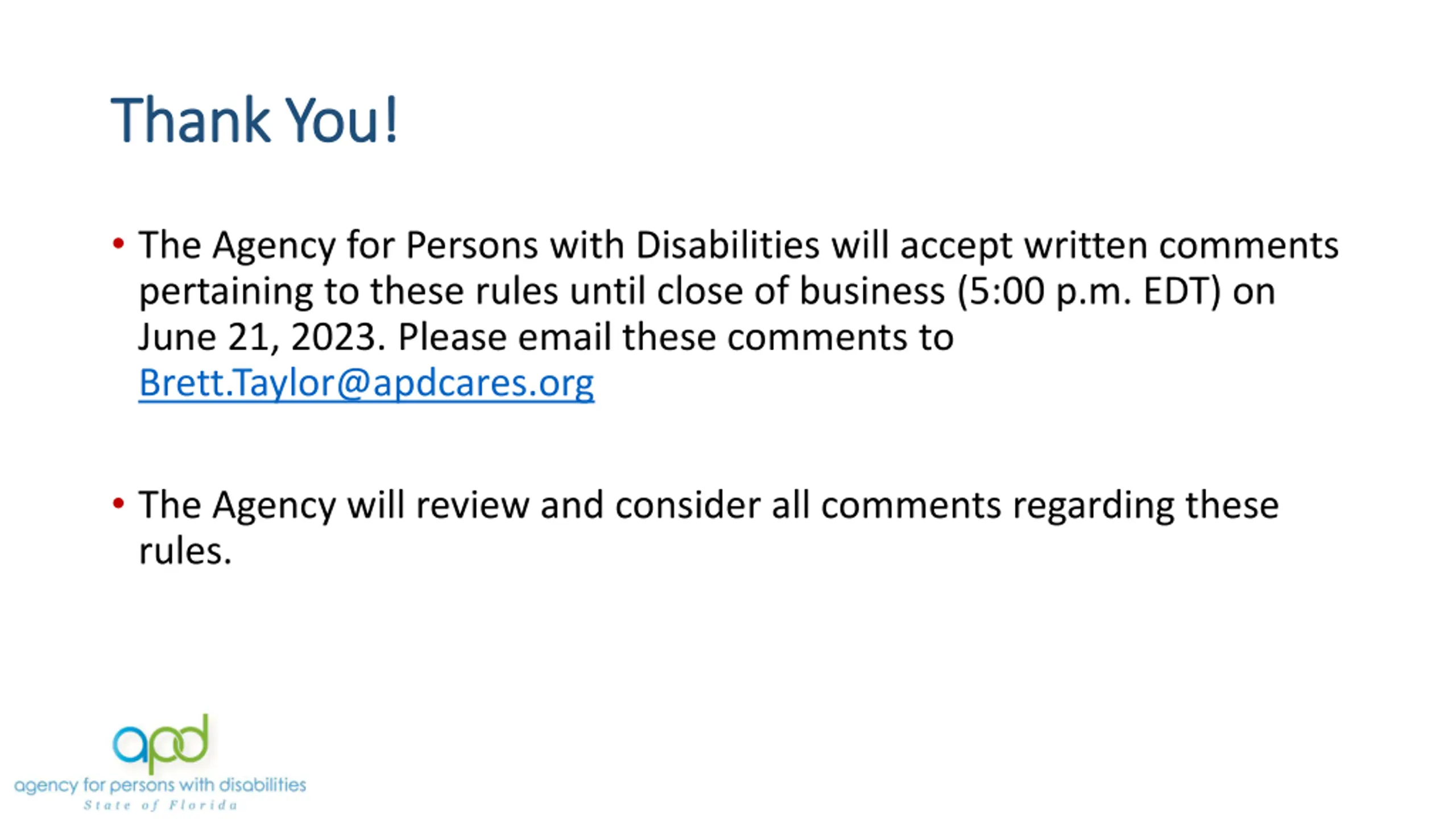 Thank You! Thank You! The Agency for Persons with Disabilities will accept written comments pertaining to these rules until close of business (5:00 p.m. EDT) on June 21, 2023. Please email these comments to Brett.Taylor@apdcares.org The Agency will review and consider all comments regarding these rules.