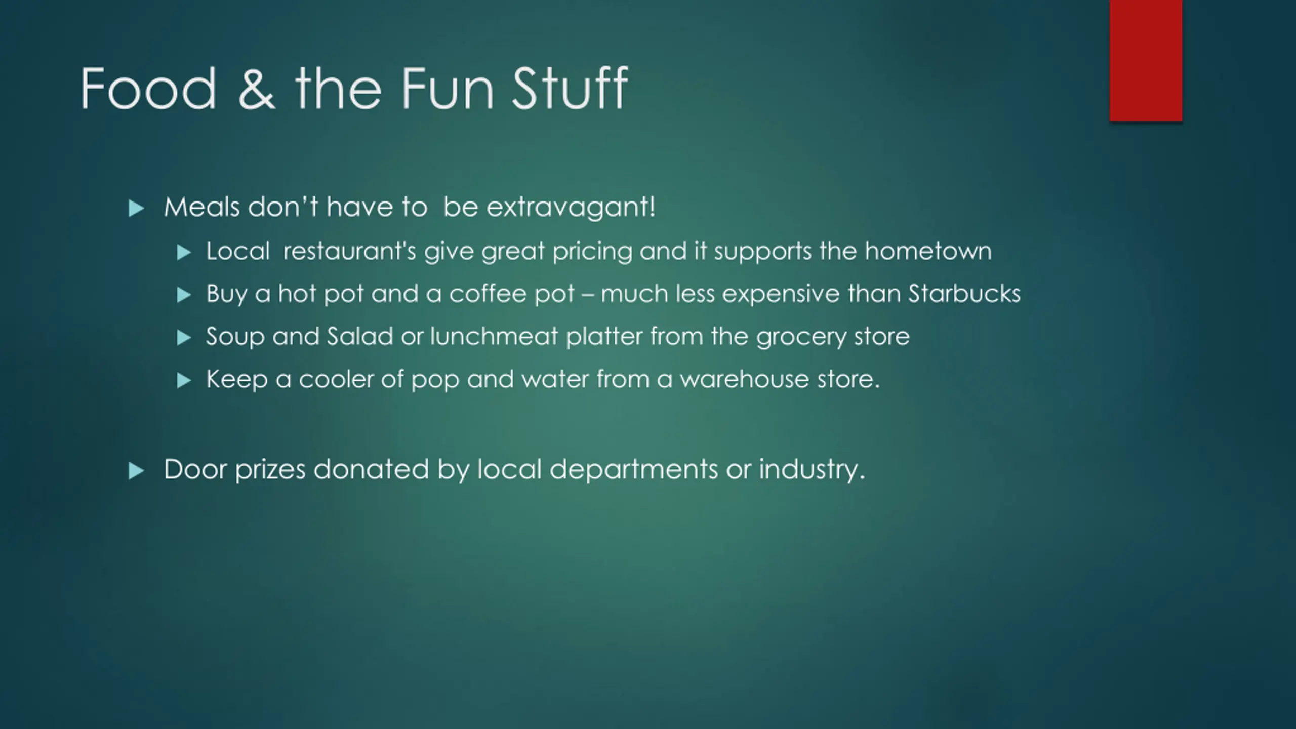Food & the Fun Stuff Meals don t have to be extravagant! Local restaurant's give great pricing and it supports the hometown Buy a hot pot and a coffee pot much less expensive than Starbucks Soup and Salad or lunchmeat platter from the grocery store Keep a cooler of pop and water from a warehouse store. Door prizes donated by local departments or industry.