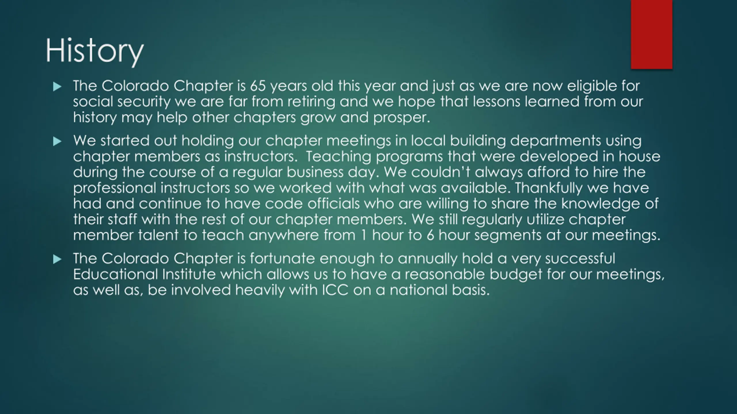 History The Colorado Chapter is 65 years old this year and just as we are now eligible for social security we are far from retiring and we hope that lessons learned from our history may help other chapters grow and prosper. We started out holding our chapter meetings in local building departments using chapter members as instructors. Teaching programs that were developed in house during the course of a regular business day. We couldn t always afford to hire the professional instructors so we worked with what was available. Thankfully we have had and continue to have code officials who are willing to share the knowledge of their staff with the rest of our chapter members. We still regularly utilize chapter member talent to teach anywhere from 1 hour to 6 hour segments at our meetings. The Colorado Chapter is fortunate enough to annually hold a very successful Educational Institute which allows us to have a reasonable budget for our meetings, as well as, be involved heavily with ICC on a national basis.