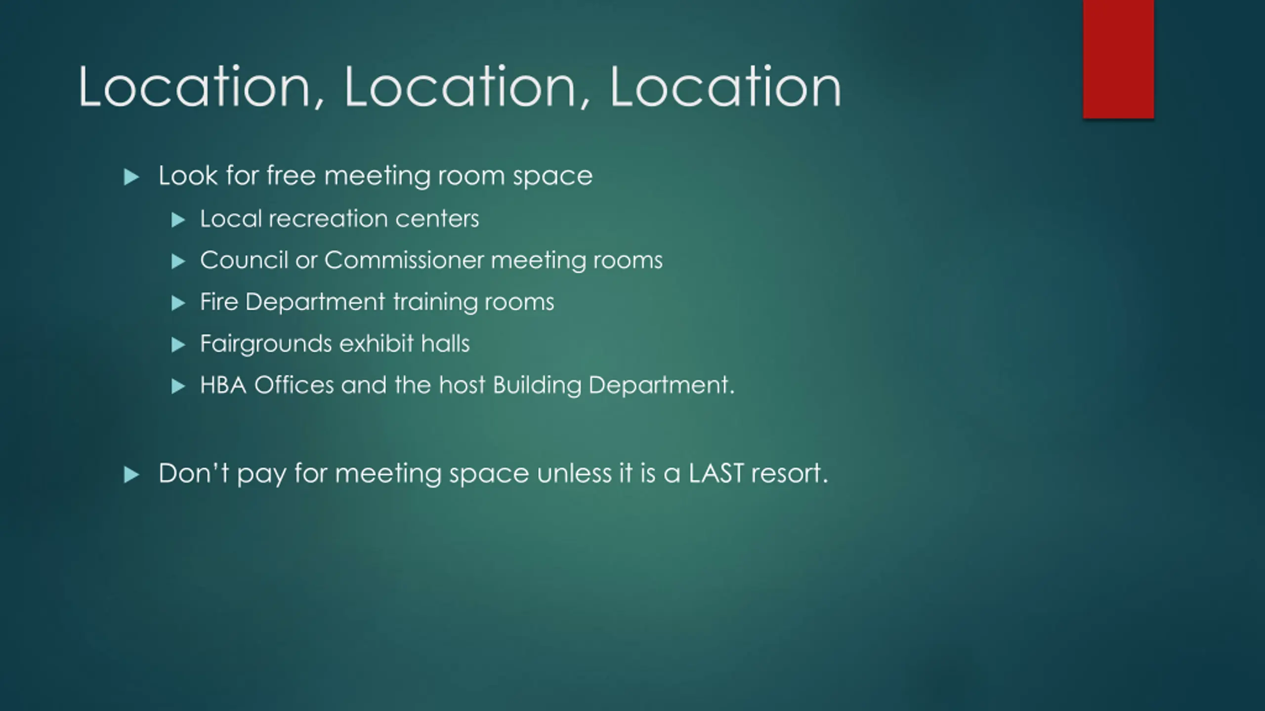 Location, Location, Location Look for free meeting room space Local recreation centers Council or Commissioner meeting rooms Fire Department training rooms Fairgrounds exhibit halls HBA Offices and the host Building Department. Don t pay for meeting space unless it is a LAST resort.