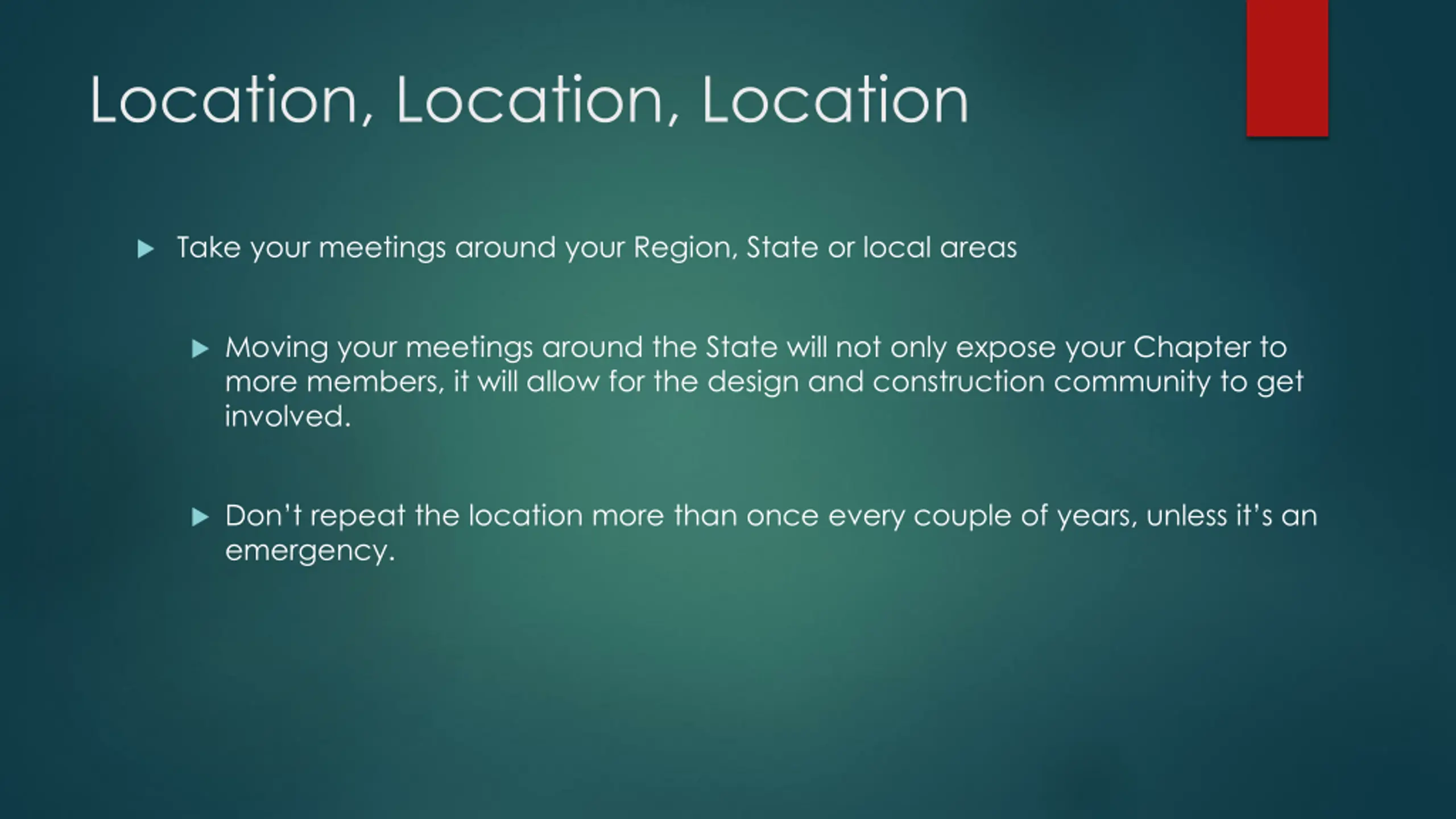 Location, Location, Location Take your meetings around your Region, State or local areas Moving your meetings around the State will not only expose your Chapter to more members, it will allow for the design and construction community to get involved. Don t repeat the location more than once every couple of years, unless it s an emergency.