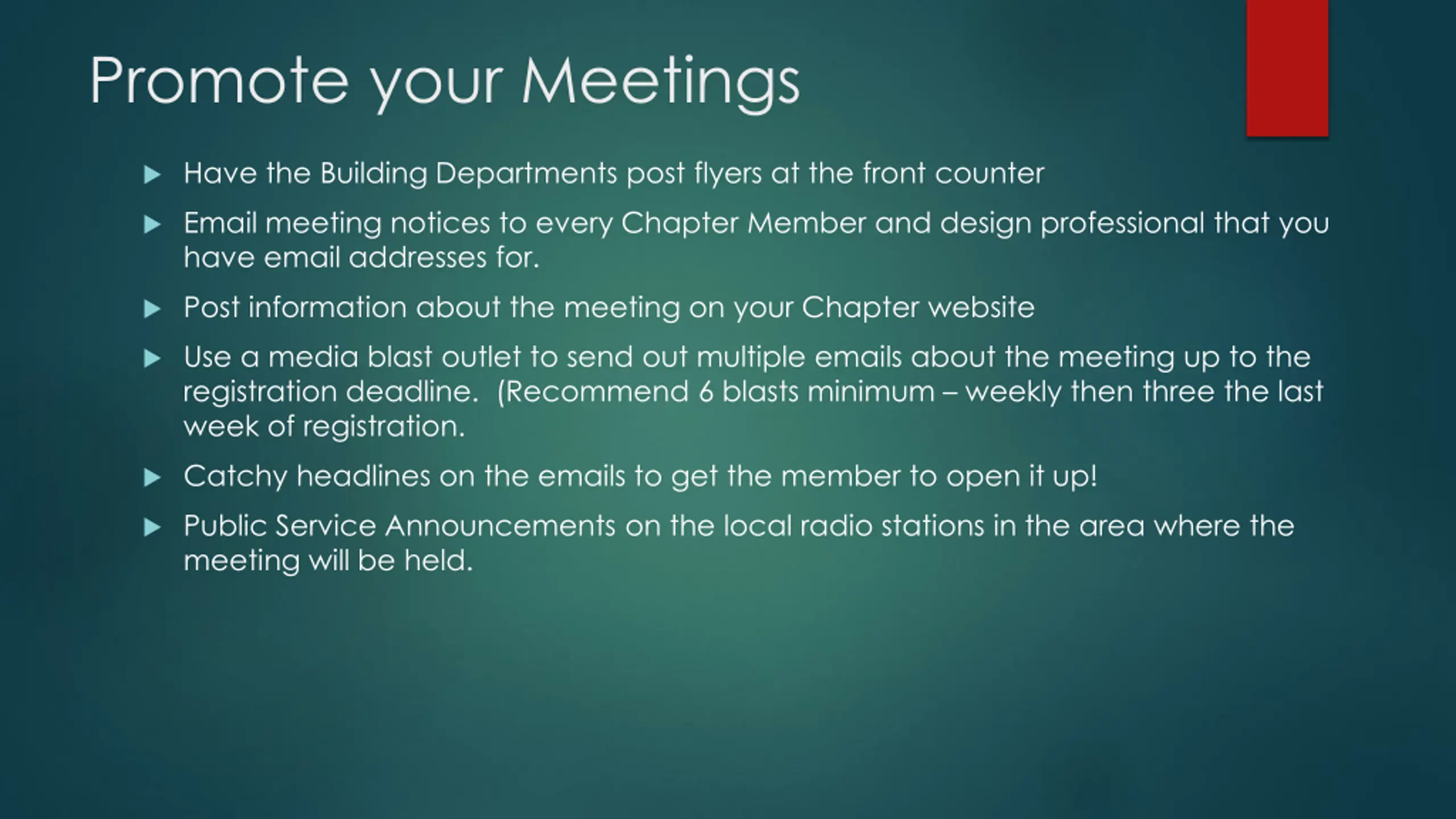 Promote your Meetings Have the Building Departments post flyers at the front counter Email meeting notices to every Chapter Member and design professional that you have email addresses for. Post information about the meeting on your Chapter website Use a media blast outlet to send out multiple emails about the meeting up to the registration deadline. (Recommend 6 blasts minimum weekly then three the last week of registration. Catchy headlines on the emails to get the member to open it up! Public Service Announcements on the local radio stations in the area where the meeting will be held.