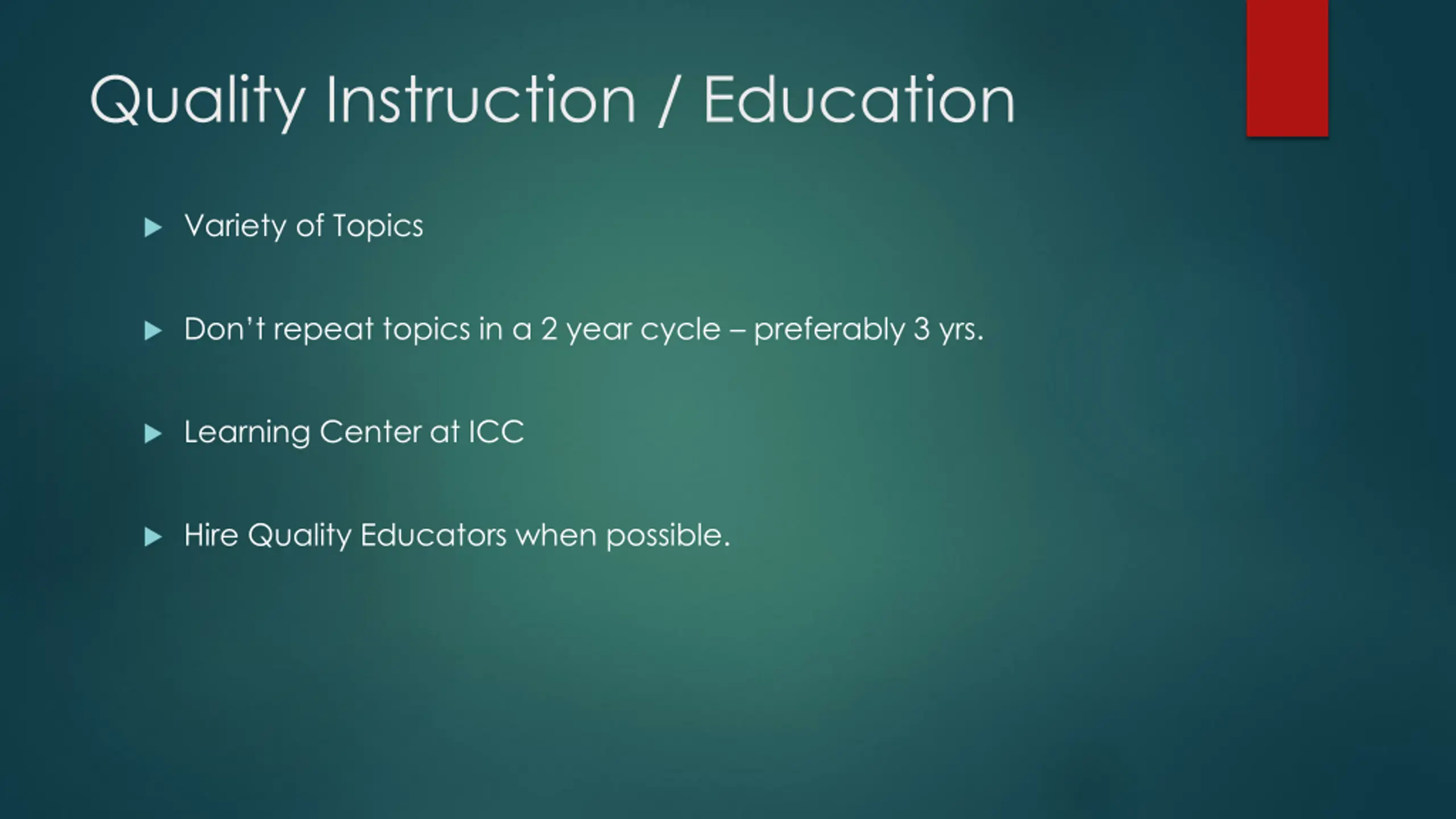 Quality Instruction / Education Variety of Topics Don t repeat topics in a 2 year cycle preferably 3 yrs. Learning Center at ICC Hire Quality Educators when possible.