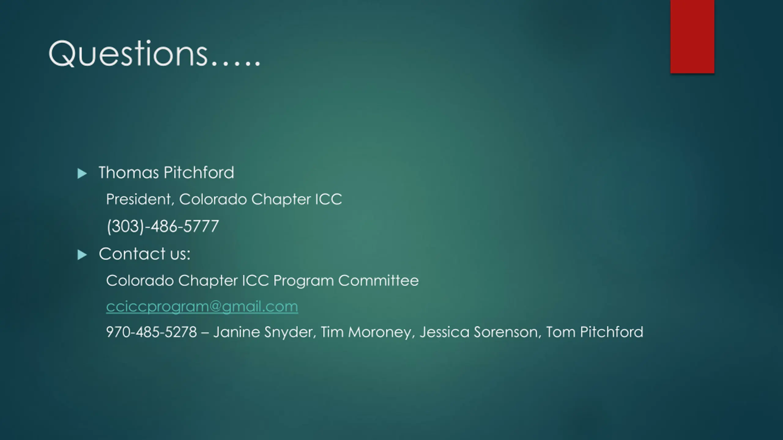 Questions.. Thomas Pitchford President, Colorado Chapter ICC (303)-486-5777 Contact us: Colorado Chapter ICC Program Committee cciccprogram@gmail.com 970-485-5278 Janine Snyder, Tim Moroney, Jessica Sorenson, Tom Pitchford