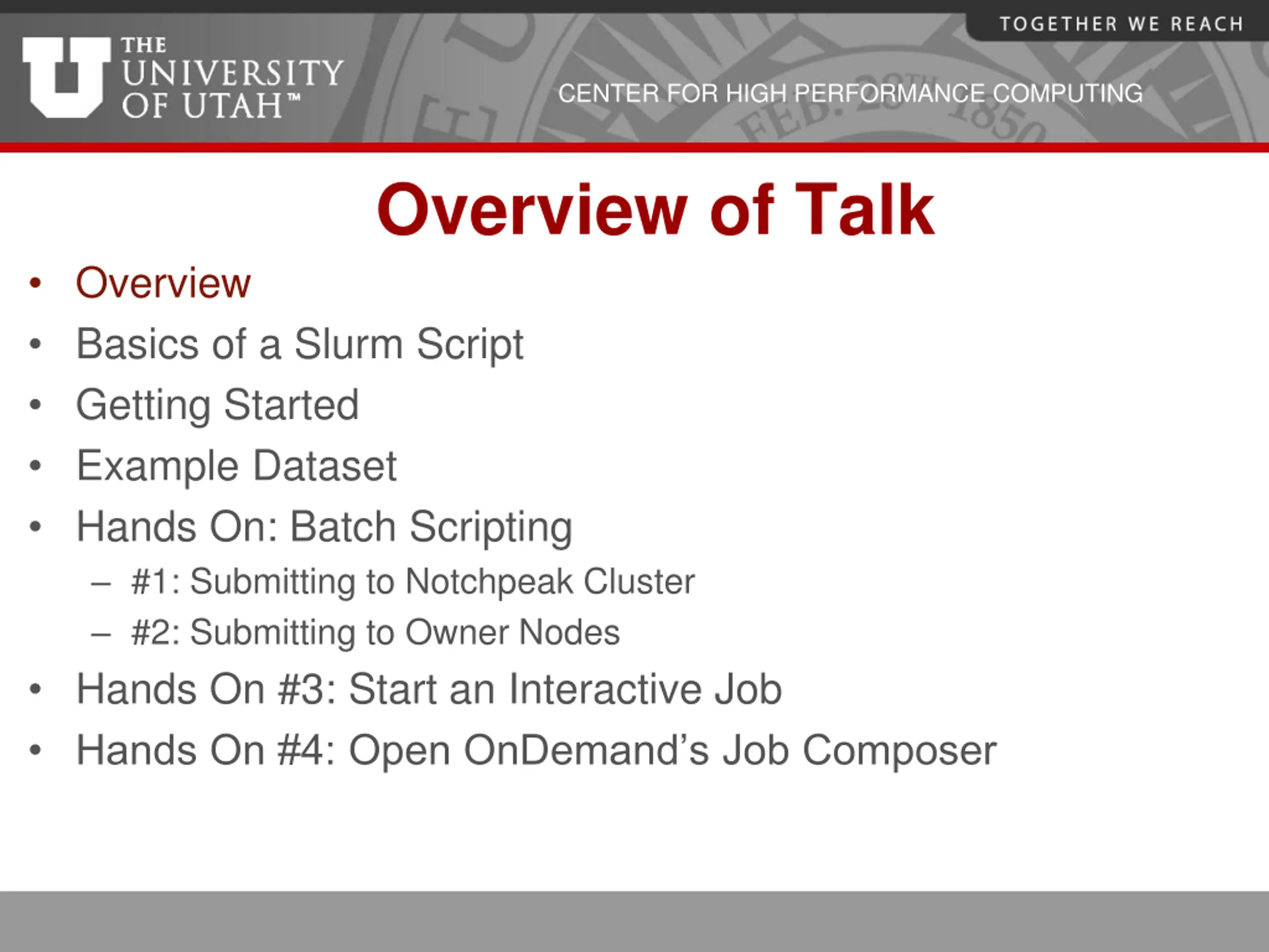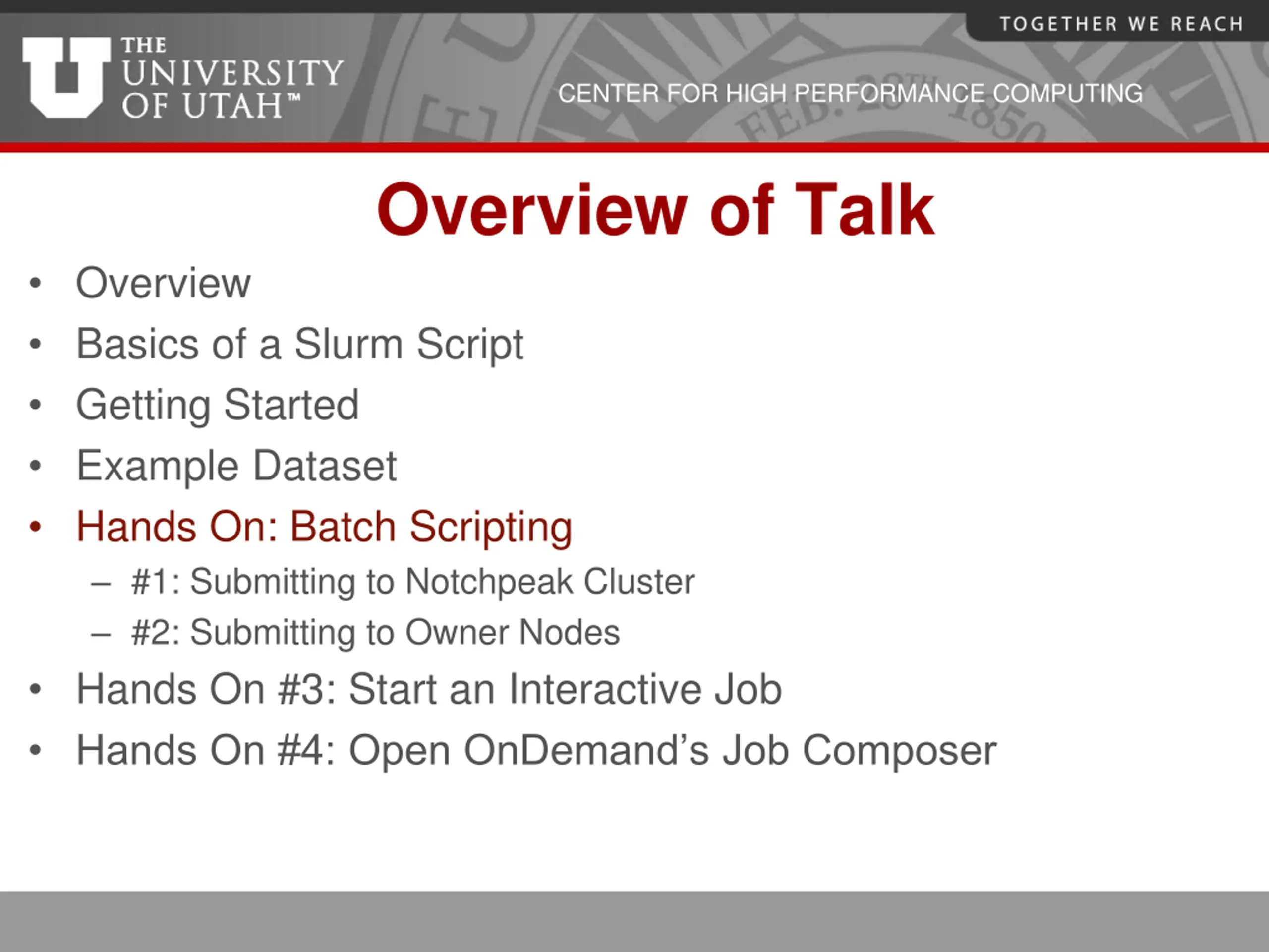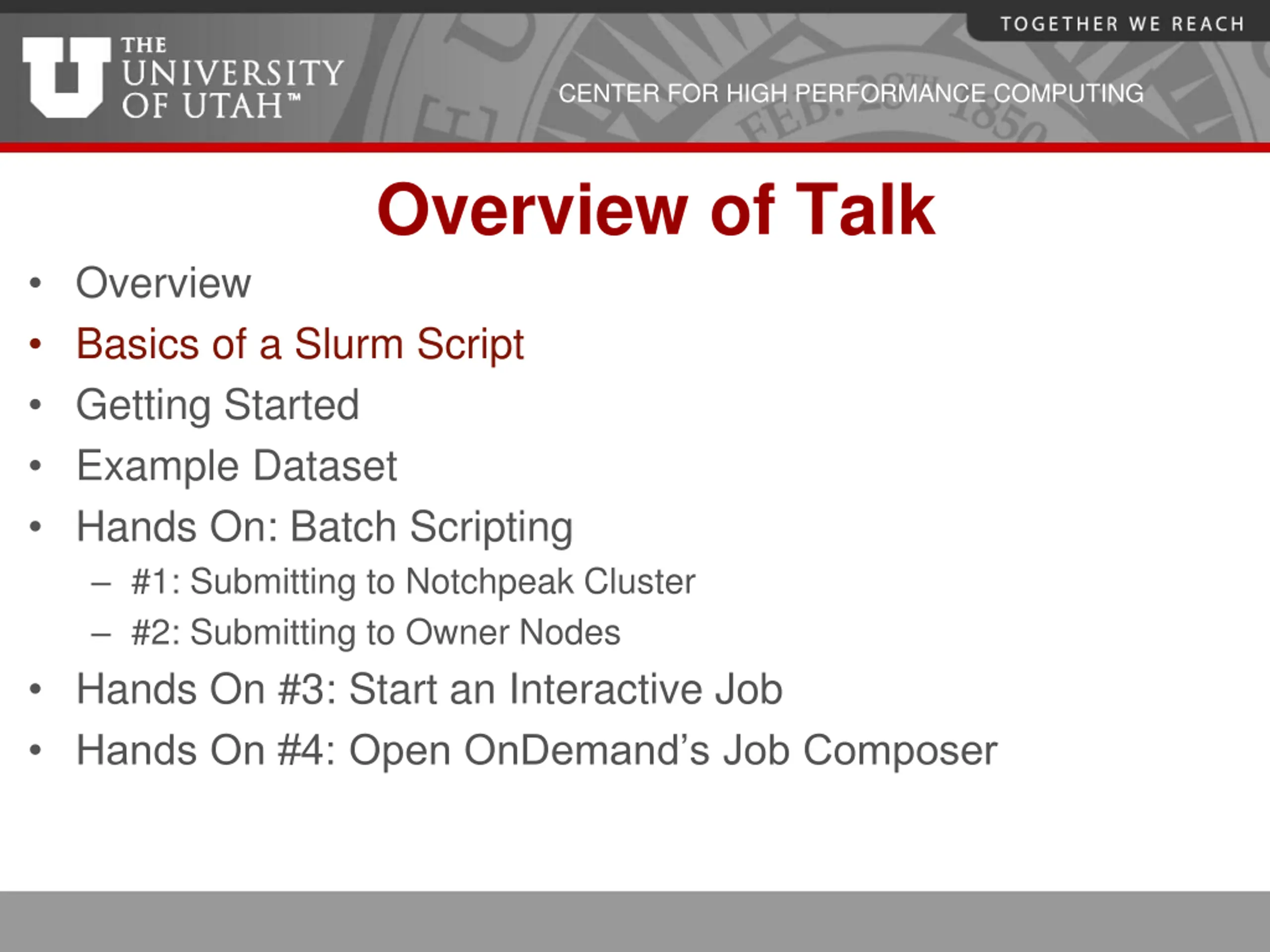 CENTER FOR HIGH PERFORMANCE COMPUTING Overview of Talk Overview Basics of a Slurm Script Getting Started Example Dataset Hands On: Batch Scripting #1: Submitting to Notchpeak Cluster #2: Submitting to Owner Nodes Hands On #3: Start an Interactive Job Hands On #4: Open OnDemand s Job Composer