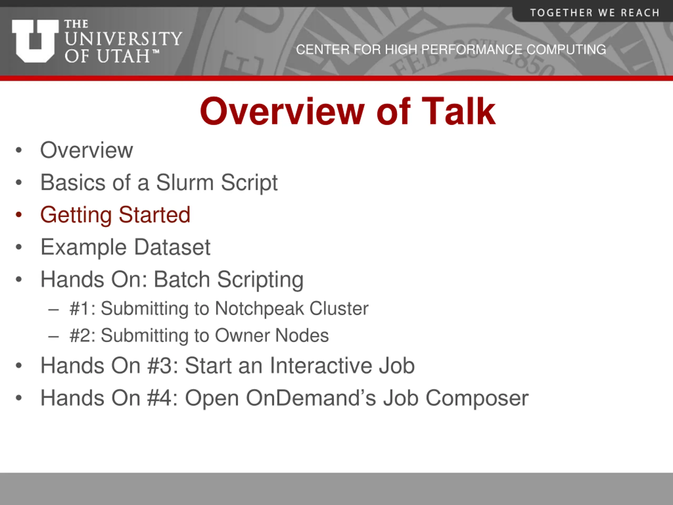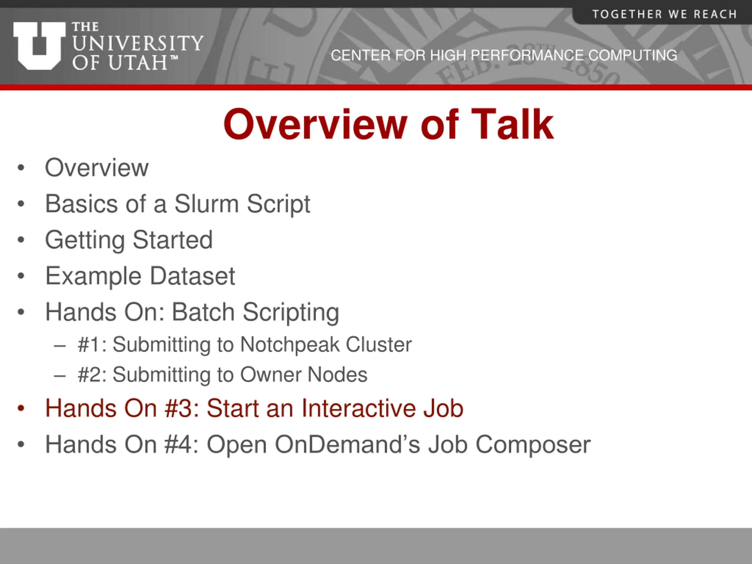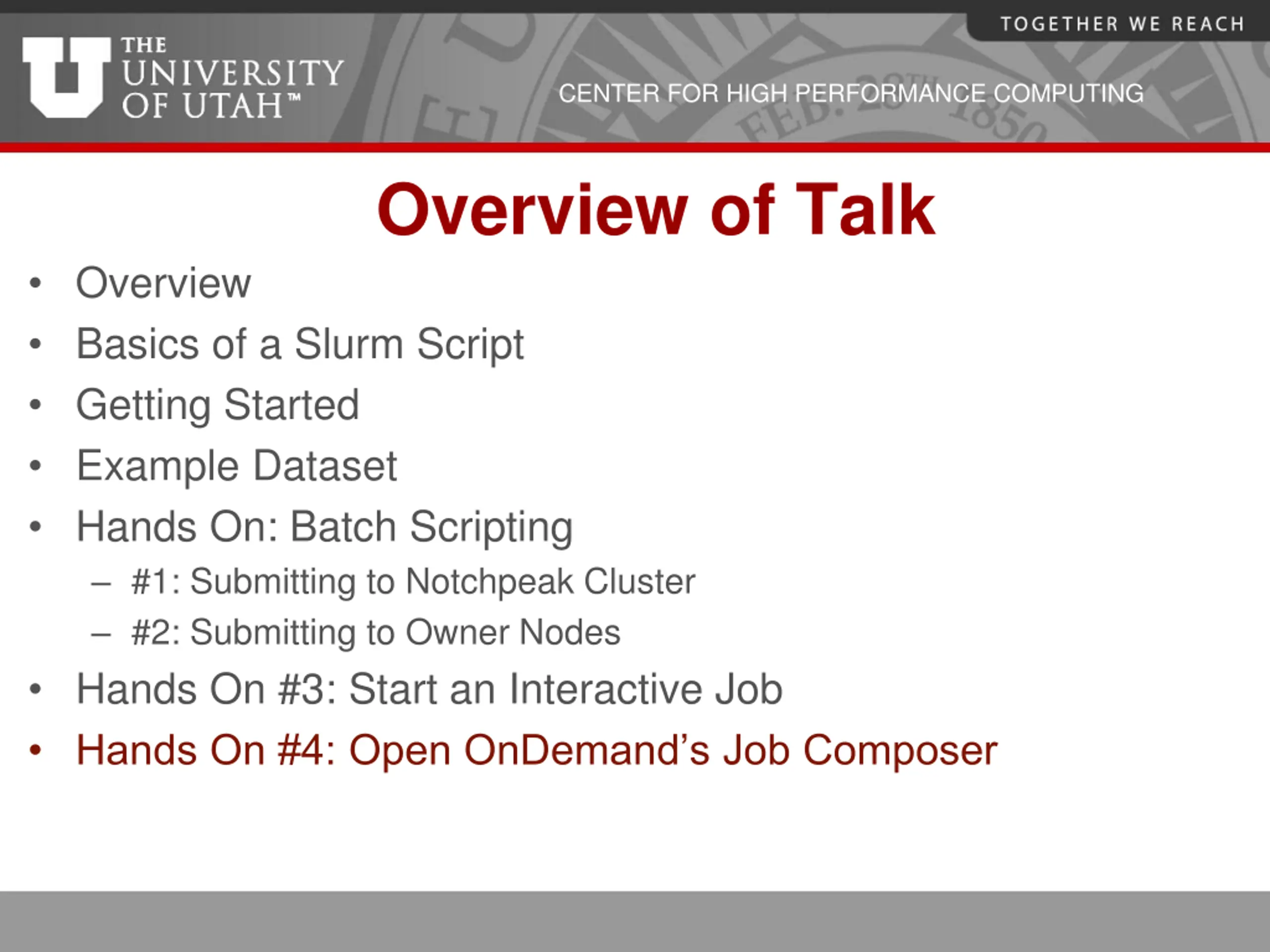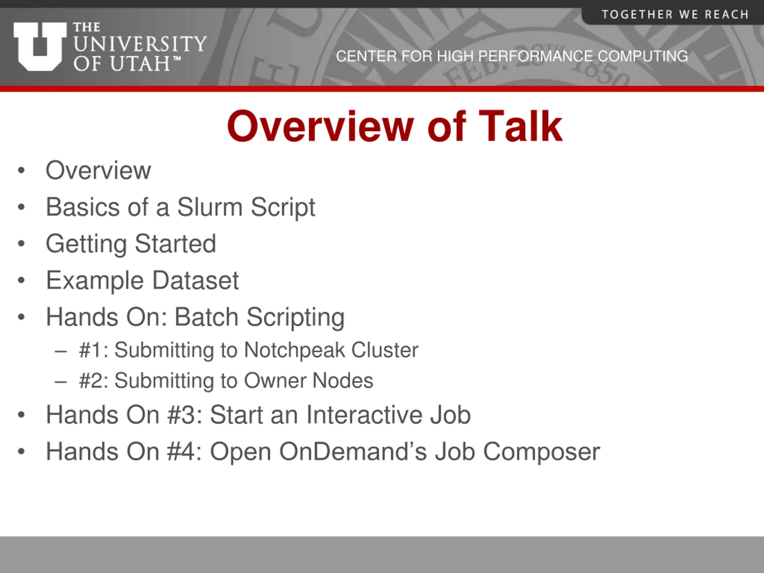 CENTER FOR HIGH PERFORMANCE COMPUTING Overview of Talk Overview Basics of a Slurm Script Getting Started Example Dataset Hands On: Batch Scripting #1: Submitting to Notchpeak Cluster #2: Submitting to Owner Nodes Hands On #3: Start an Interactive Job Hands On #4: Open OnDemand s Job Composer