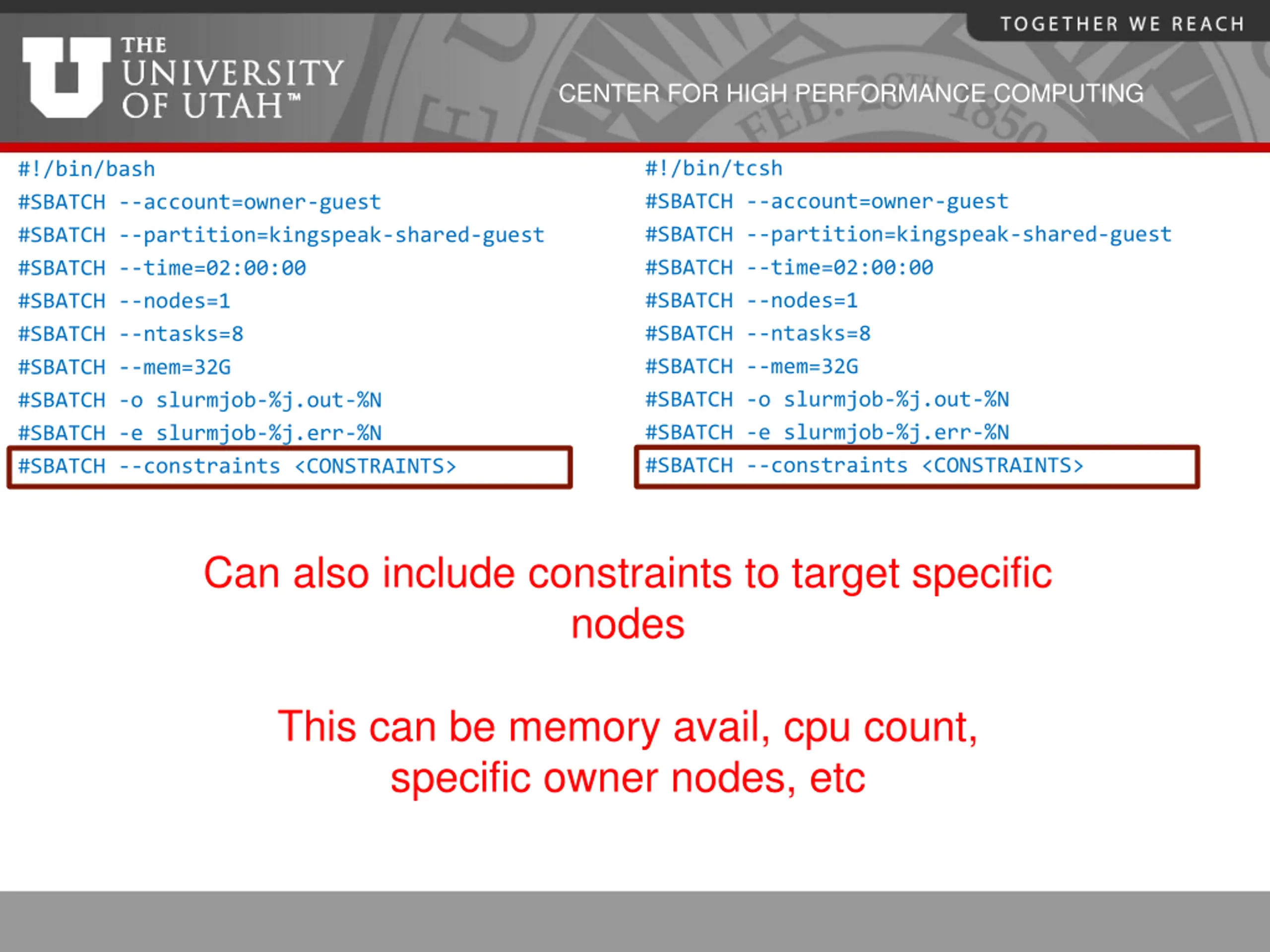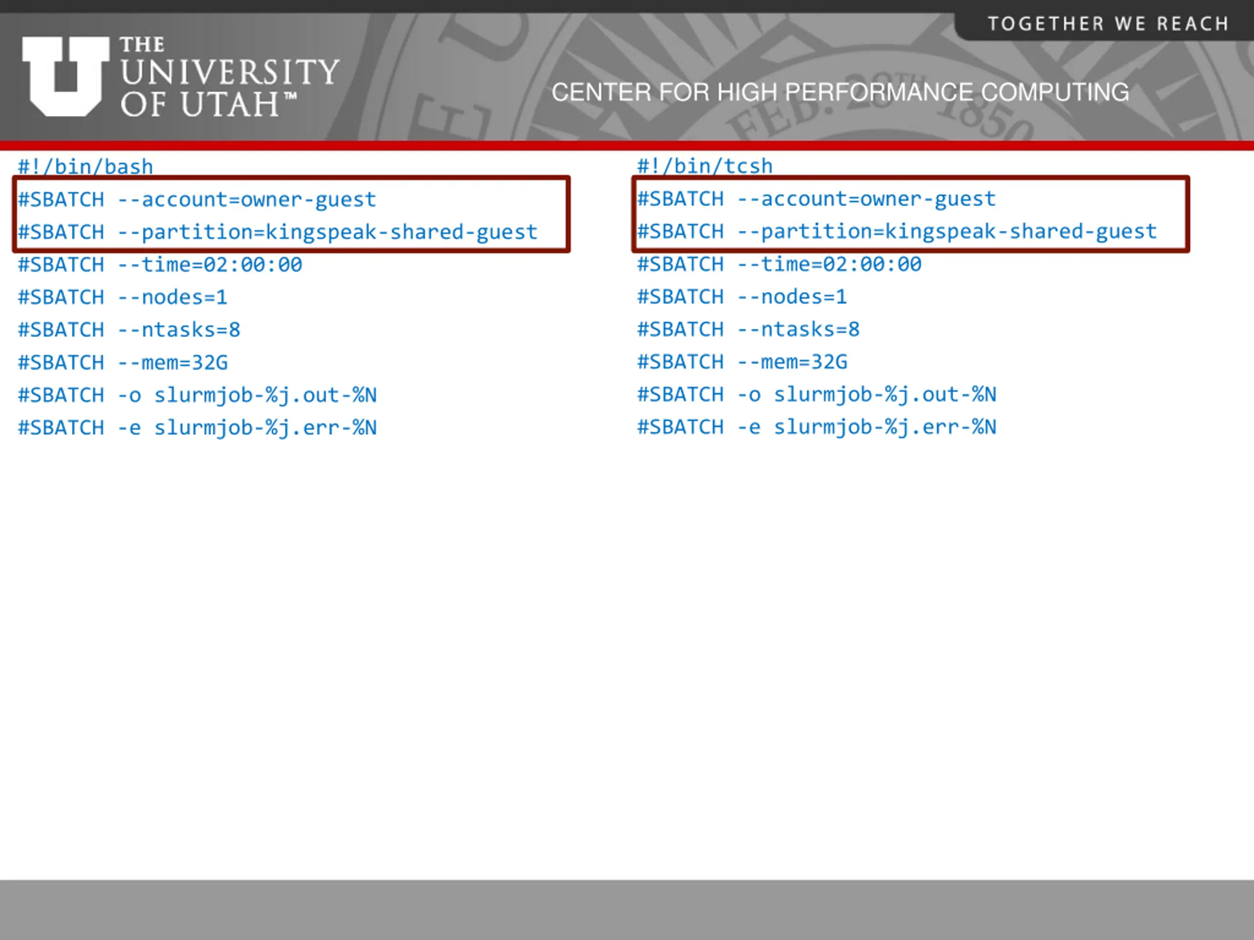 CENTER FOR HIGH PERFORMANCE COMPUTING #!/bin/tcsh #SBATCH --account=owner-guest #SBATCH --partition=kingspeak-shared-guest #SBATCH --time=02:00:00 #SBATCH --nodes=1 #SBATCH --ntasks=8 #SBATCH --mem=32G #SBATCH -o slurmjob-%j.out-%N #SBATCH -e slurmjob-%j.err-%N #SBATCH --constraints <CONSTRAINTS> #!/bin/bash #SBATCH --account=owner-guest #SBATCH --partition=kingspeak-shared-guest #SBATCH --time=02:00:00 #SBATCH --nodes=1 #SBATCH --ntasks=8 #SBATCH --mem=32G #SBATCH -o slurmjob-%j.out-%N #SBATCH -e slurmjob-%j.err-%N #SBATCH --constraints <CONSTRAINTS> Can also include constraints to target specific nodes This can be memory avail, cpu count, specific owner nodes, etc
