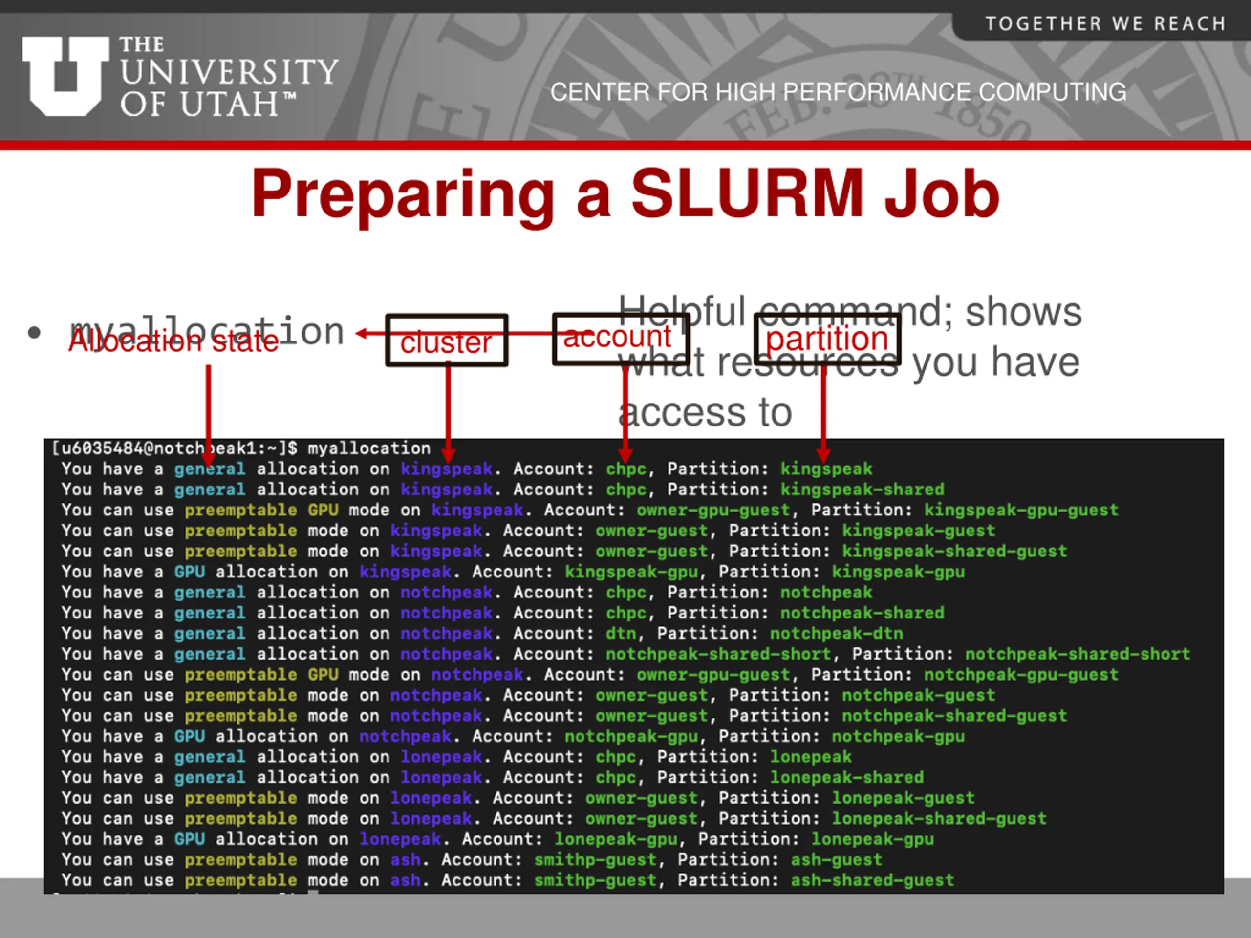 CENTER FOR HIGH PERFORMANCE COMPUTING Preparing a SLURM Job Helpful command; shows what resources you have access to myallocation Allocation state partition account cluster