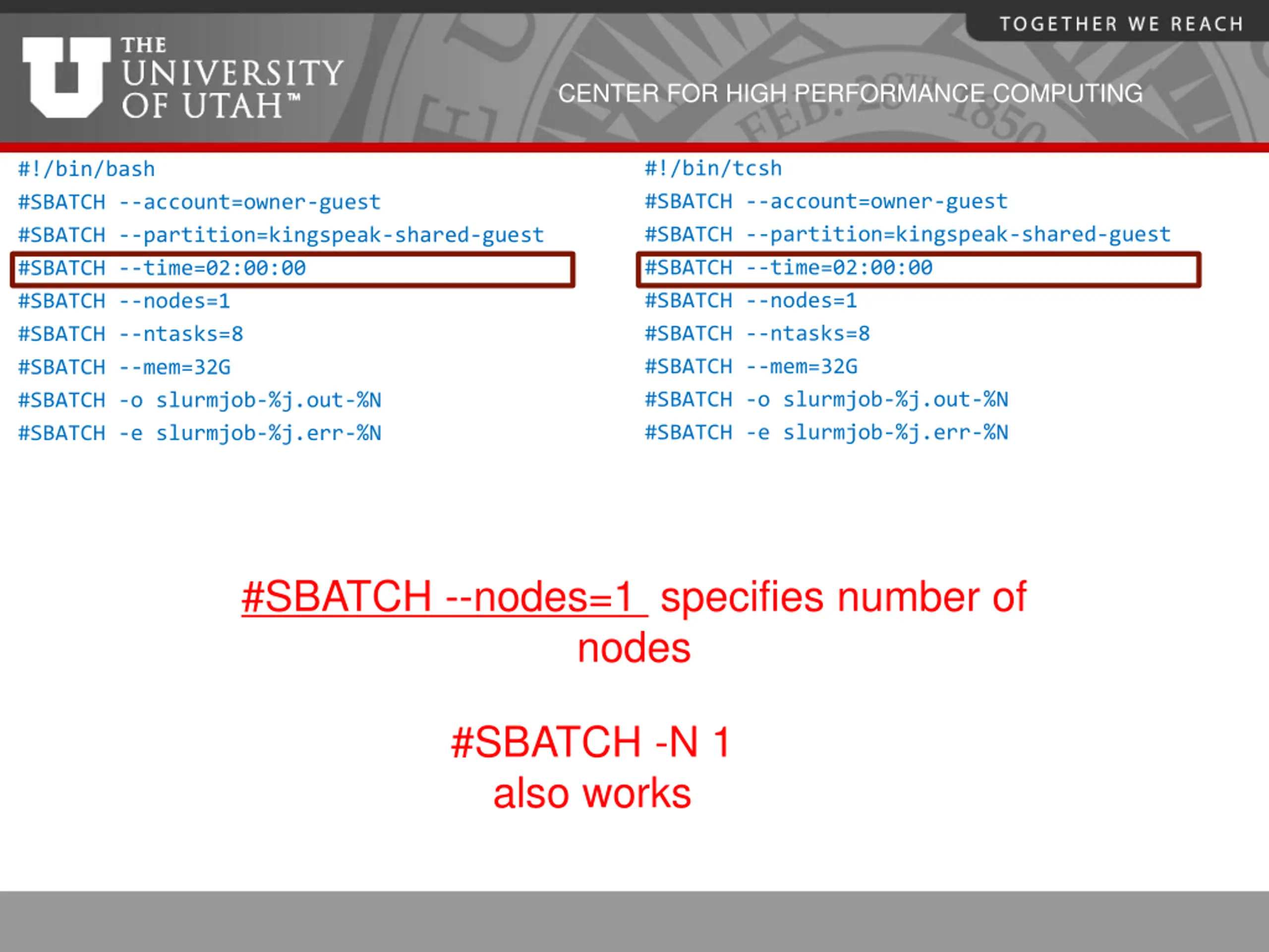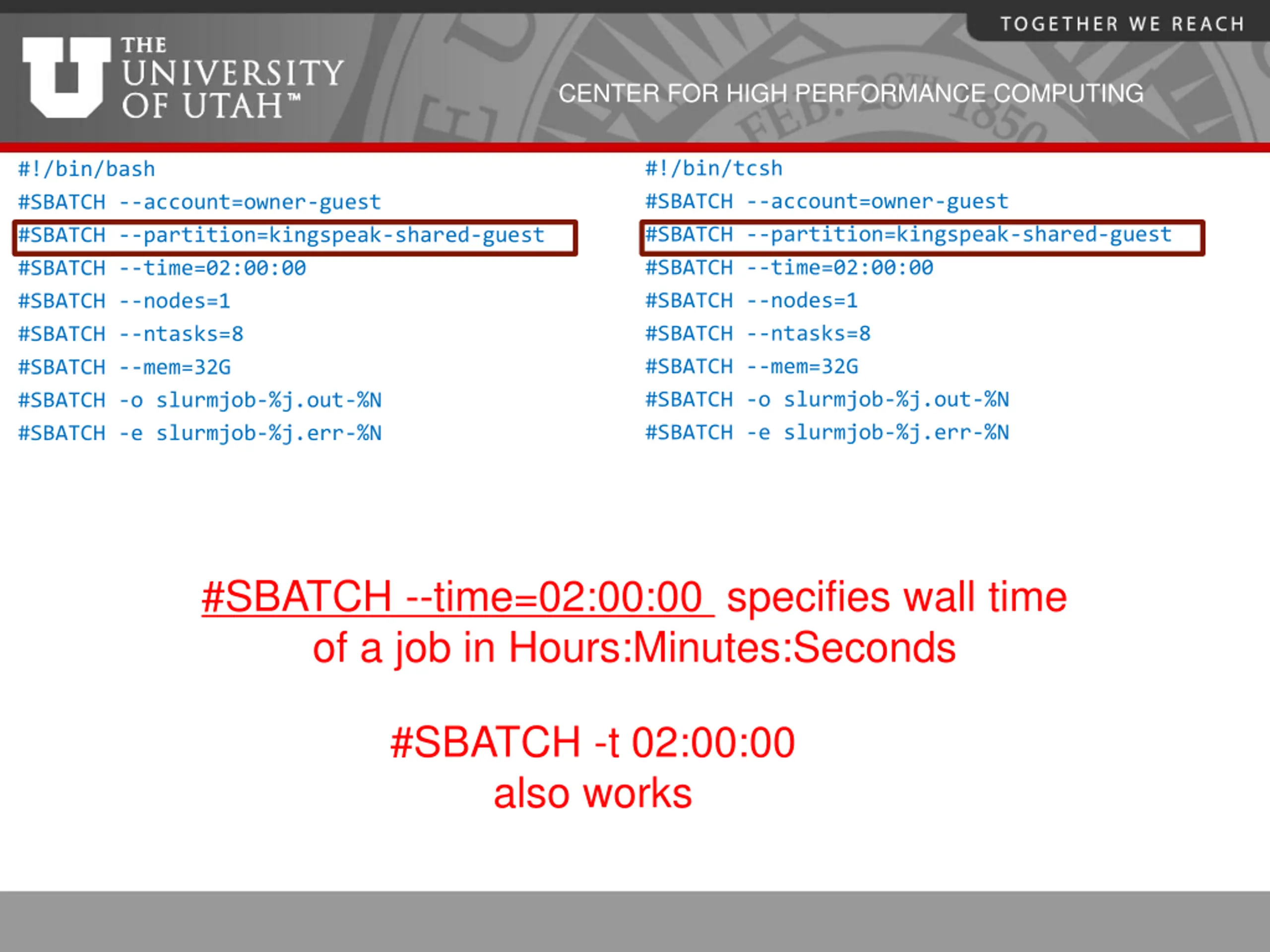 CENTER FOR HIGH PERFORMANCE COMPUTING #!/bin/tcsh #SBATCH --account=owner-guest #SBATCH --partition=kingspeak-shared-guest #SBATCH --time=02:00:00 #SBATCH --nodes=1 #SBATCH --ntasks=8 #SBATCH --mem=32G #SBATCH -o slurmjob-%j.out-%N #SBATCH -e slurmjob-%j.err-%N #!/bin/bash #SBATCH --account=owner-guest #SBATCH --partition=kingspeak-shared-guest #SBATCH --time=02:00:00 #SBATCH --nodes=1 #SBATCH --ntasks=8 #SBATCH --mem=32G #SBATCH -o slurmjob-%j.out-%N #SBATCH -e slurmjob-%j.err-%N #SBATCH --time=02:00:00 specifies wall time of a job in Hours:Minutes:Seconds #SBATCH -t 02:00:00 also works