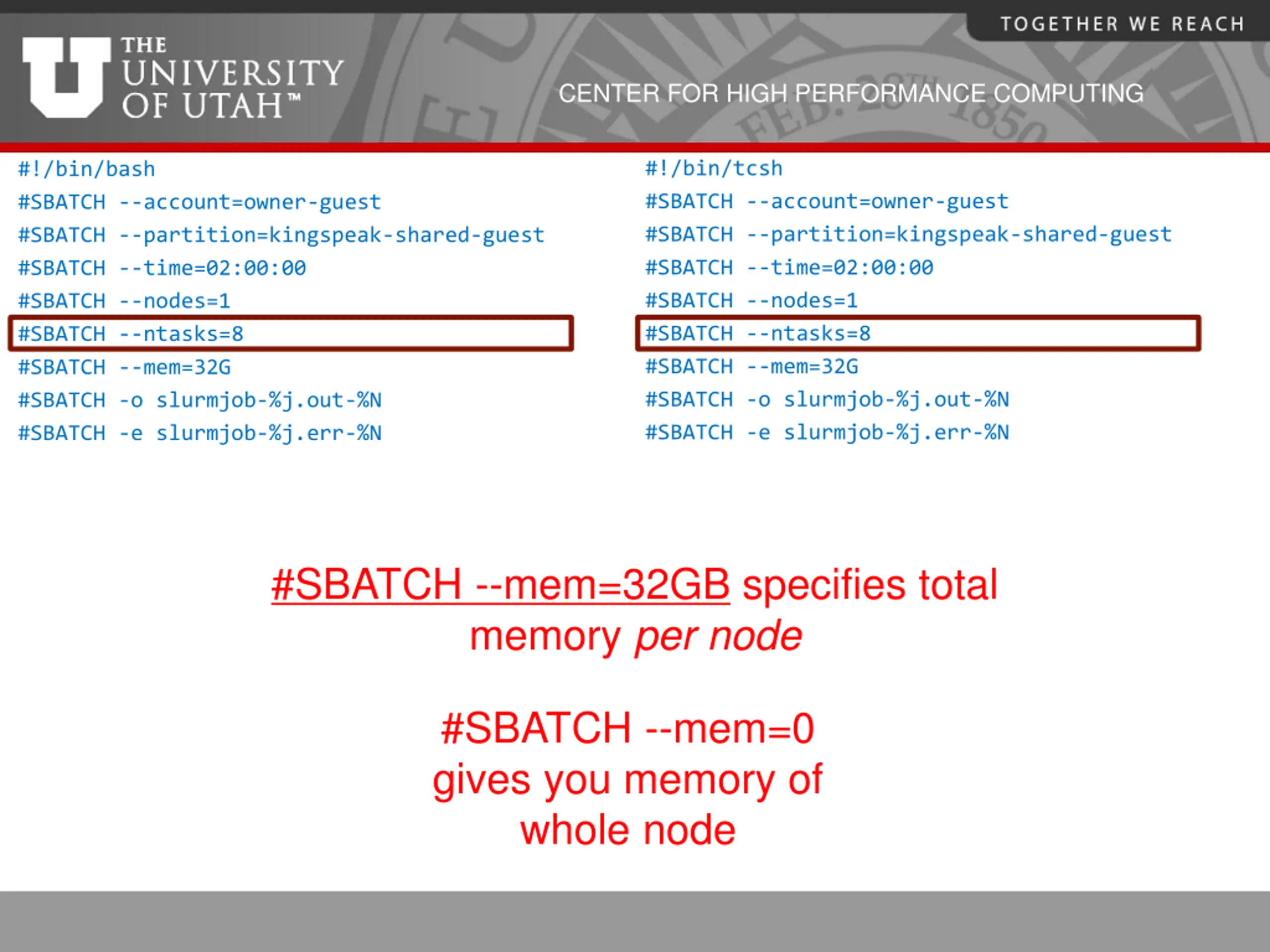 CENTER FOR HIGH PERFORMANCE COMPUTING #!/bin/tcsh #SBATCH --account=owner-guest #SBATCH --partition=kingspeak-shared-guest #SBATCH --time=02:00:00 #SBATCH --nodes=1 #SBATCH --ntasks=8 #SBATCH --mem=32G #SBATCH -o slurmjob-%j.out-%N #SBATCH -e slurmjob-%j.err-%N #!/bin/bash #SBATCH --account=owner-guest #SBATCH --partition=kingspeak-shared-guest #SBATCH --time=02:00:00 #SBATCH --nodes=1 #SBATCH --ntasks=8 #SBATCH --mem=32G #SBATCH -o slurmjob-%j.out-%N #SBATCH -e slurmjob-%j.err-%N #SBATCH --mem=32GB specifies total memory per node #SBATCH --mem=0 gives you memory of whole node