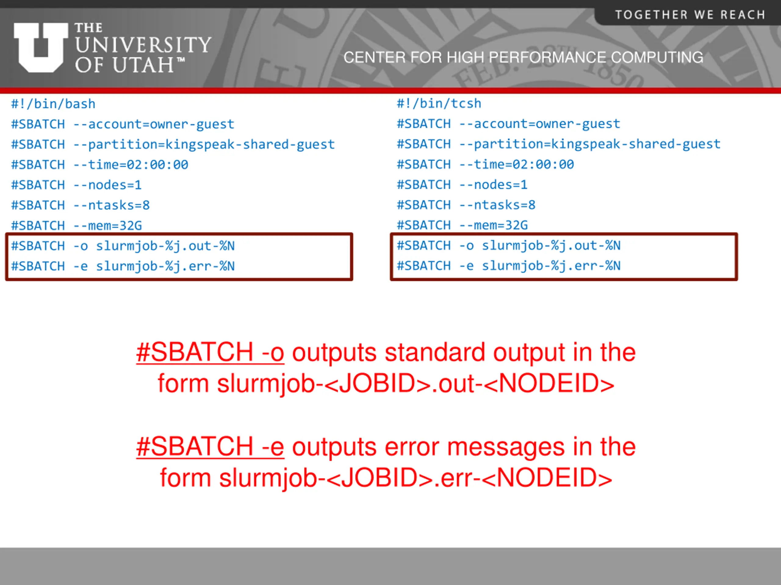 CENTER FOR HIGH PERFORMANCE COMPUTING #!/bin/tcsh #SBATCH --account=owner-guest #SBATCH --partition=kingspeak-shared-guest #SBATCH --time=02:00:00 #SBATCH --nodes=1 #SBATCH --ntasks=8 #SBATCH --mem=32G #SBATCH -o slurmjob-%j.out-%N #SBATCH -e slurmjob-%j.err-%N #!/bin/bash #SBATCH --account=owner-guest #SBATCH --partition=kingspeak-shared-guest #SBATCH --time=02:00:00 #SBATCH --nodes=1 #SBATCH --ntasks=8 #SBATCH --mem=32G #SBATCH -o slurmjob-%j.out-%N #SBATCH -e slurmjob-%j.err-%N #SBATCH -o outputs standard output in the form slurmjob-<JOBID>.out-<NODEID> #SBATCH -e outputs error messages in the form slurmjob-<JOBID>.err-<NODEID>