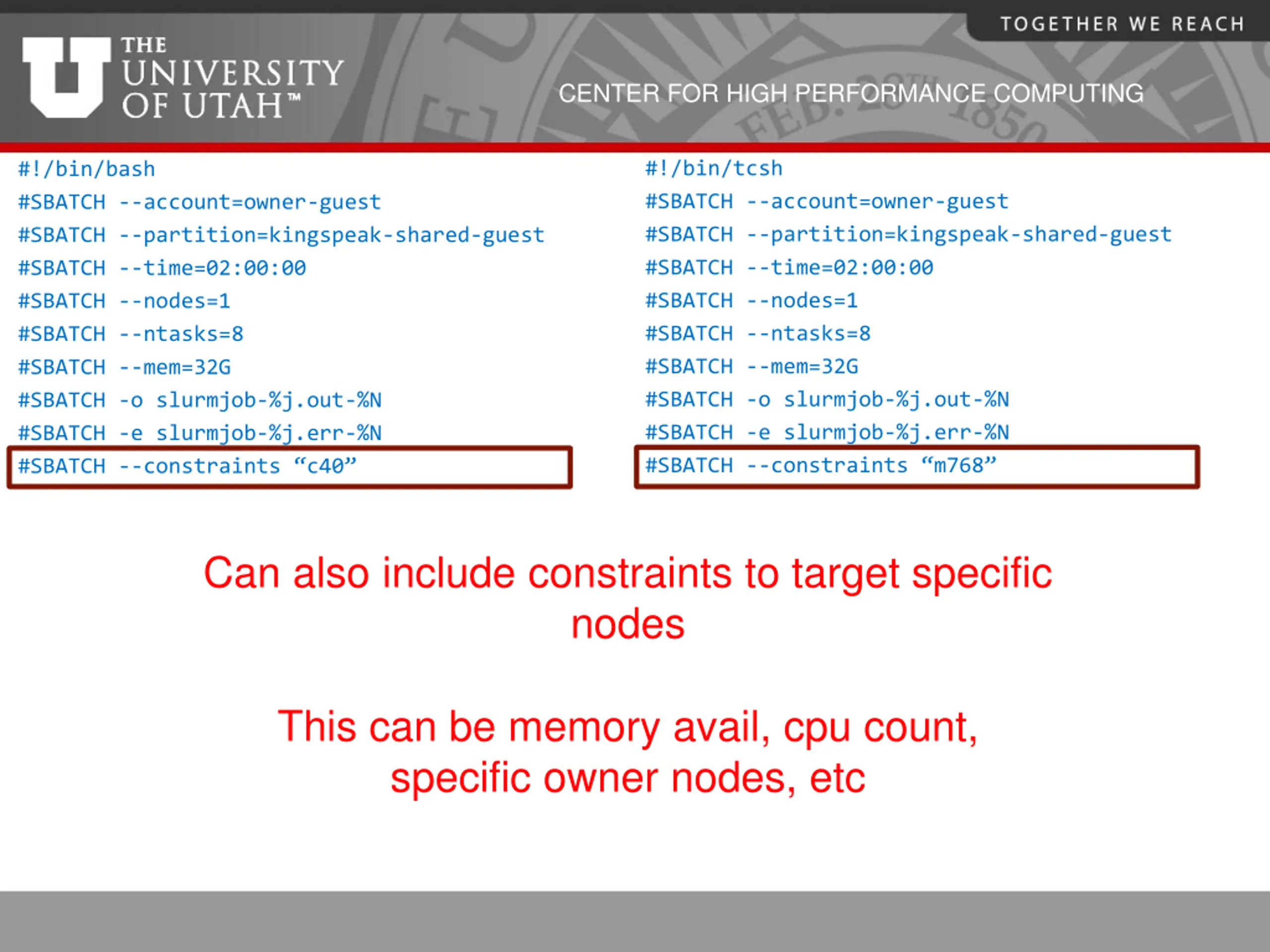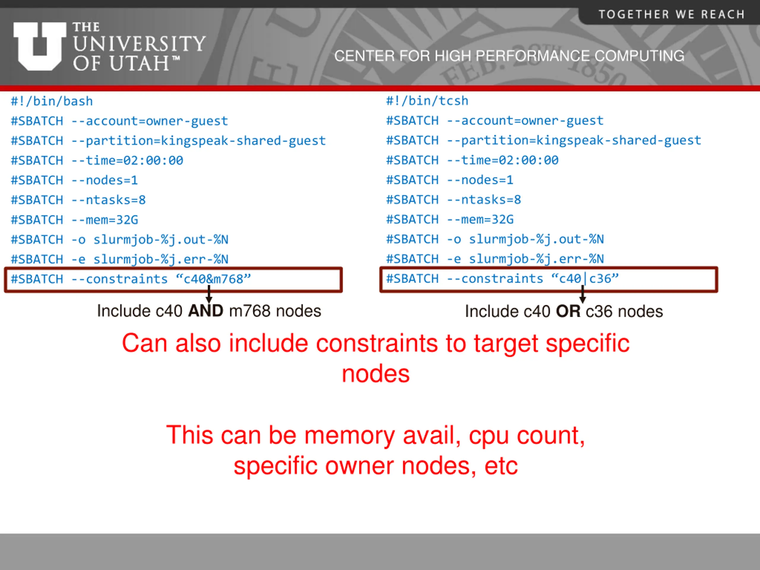 CENTER FOR HIGH PERFORMANCE COMPUTING #!/bin/tcsh #SBATCH --account=owner-guest #SBATCH --partition=kingspeak-shared-guest #SBATCH --time=02:00:00 #SBATCH --nodes=1 #SBATCH --ntasks=8 #SBATCH --mem=32G #SBATCH -o slurmjob-%j.out-%N #SBATCH -e slurmjob-%j.err-%N #SBATCH --constraints c40|c36 #!/bin/bash #SBATCH --account=owner-guest #SBATCH --partition=kingspeak-shared-guest #SBATCH --time=02:00:00 #SBATCH --nodes=1 #SBATCH --ntasks=8 #SBATCH --mem=32G #SBATCH -o slurmjob-%j.out-%N #SBATCH -e slurmjob-%j.err-%N #SBATCH --constraints c40&m768 Include c40 AND m768 nodes Include c40 OR c36 nodes Can also include constraints to target specific nodes This can be memory avail, cpu count, specific owner nodes, etc