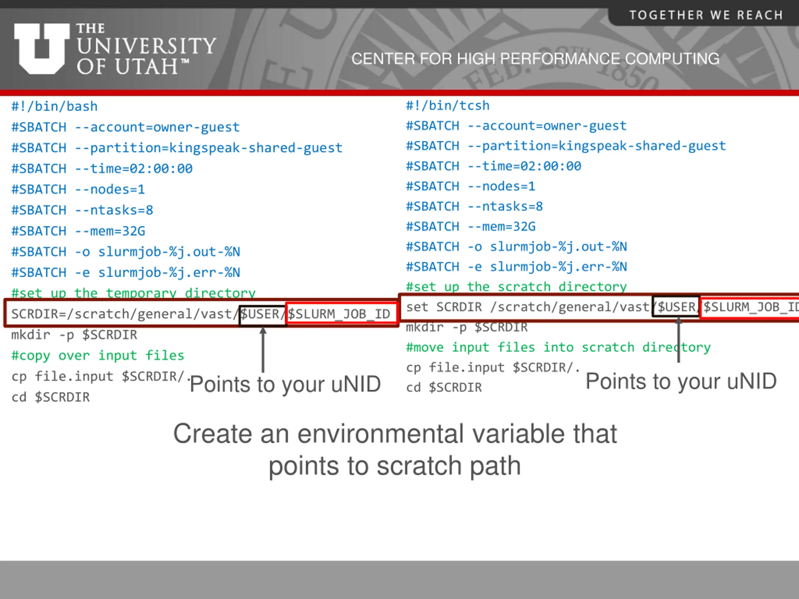 CENTER FOR HIGH PERFORMANCE COMPUTING #!/bin/tcsh #SBATCH --account=owner-guest #SBATCH --partition=kingspeak-shared-guest #SBATCH --time=02:00:00 #SBATCH --nodes=1 #SBATCH --ntasks=8 #SBATCH --mem=32G #SBATCH -o slurmjob-%j.out-%N #SBATCH -e slurmjob-%j.err-%N #set up the scratch directory set SCRDIR /scratch/general/vast/$USER/$SLURM_JOB_ID mkdir -p $SCRDIR #move input files into scratch directory cp file.input $SCRDIR/. cd $SCRDIR Points to your uNID #!/bin/bash #SBATCH --account=owner-guest #SBATCH --partition=kingspeak-shared-guest #SBATCH --time=02:00:00 #SBATCH --nodes=1 #SBATCH --ntasks=8 #SBATCH --mem=32G #SBATCH -o slurmjob-%j.out-%N #SBATCH -e slurmjob-%j.err-%N #set up the temporary directory SCRDIR=/scratch/general/vast/$USER/$SLURM_JOB_ID mkdir -p $SCRDIR #copy over input files cp file.input $SCRDIR/. cd $SCRDIR Create an environmental variable that points to scratch path Points to your uNID