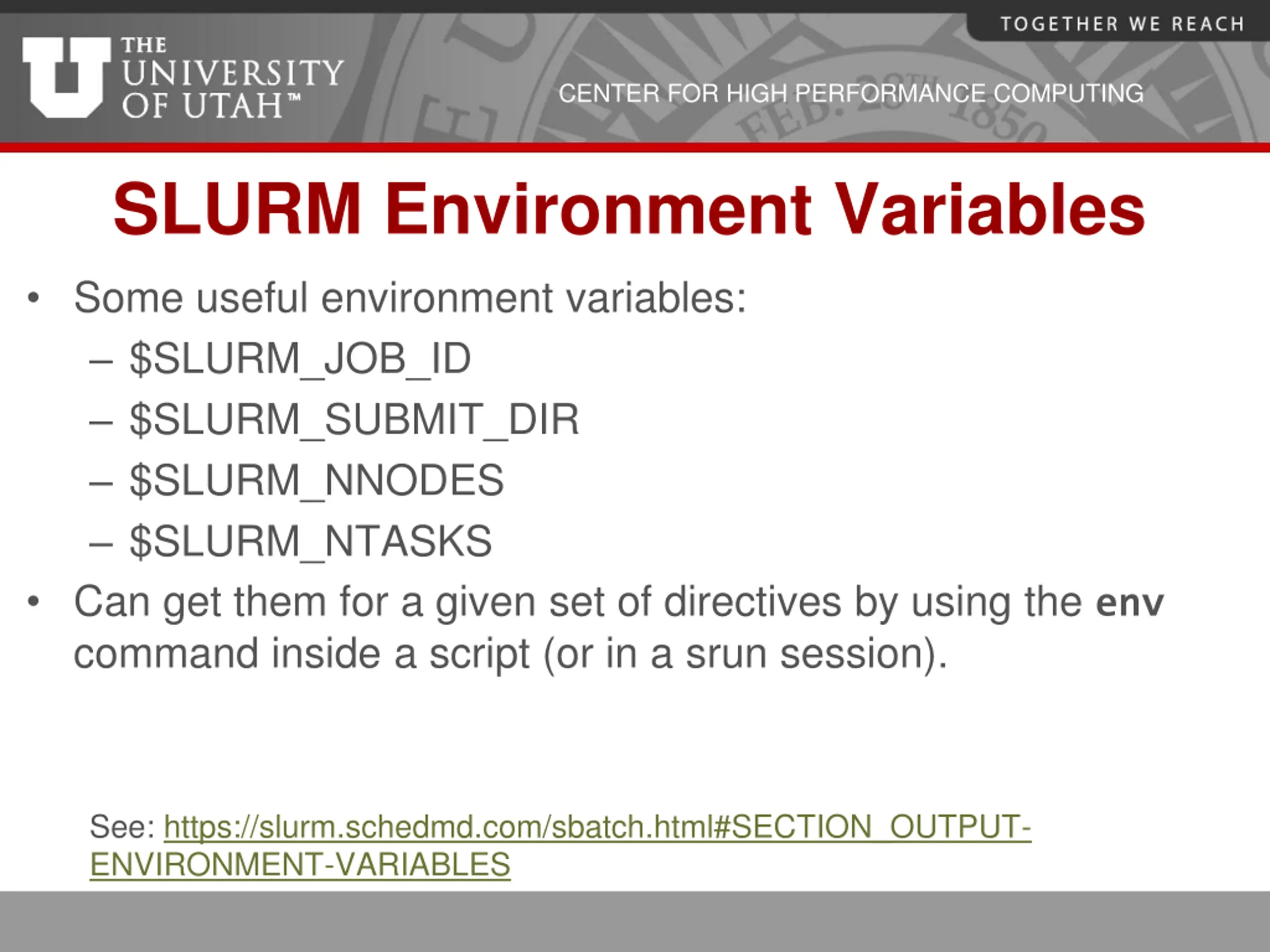 CENTER FOR HIGH PERFORMANCE COMPUTING SLURM Environment Variables Some useful environment variables: $SLURM_JOB_ID $SLURM_SUBMIT_DIR $SLURM_NNODES $SLURM_NTASKS Can get them for a given set of directives by using the env command inside a script (or in a srun session). See: https://slurm.schedmd.com/sbatch.html#SECTION_OUTPUT- ENVIRONMENT-VARIABLES