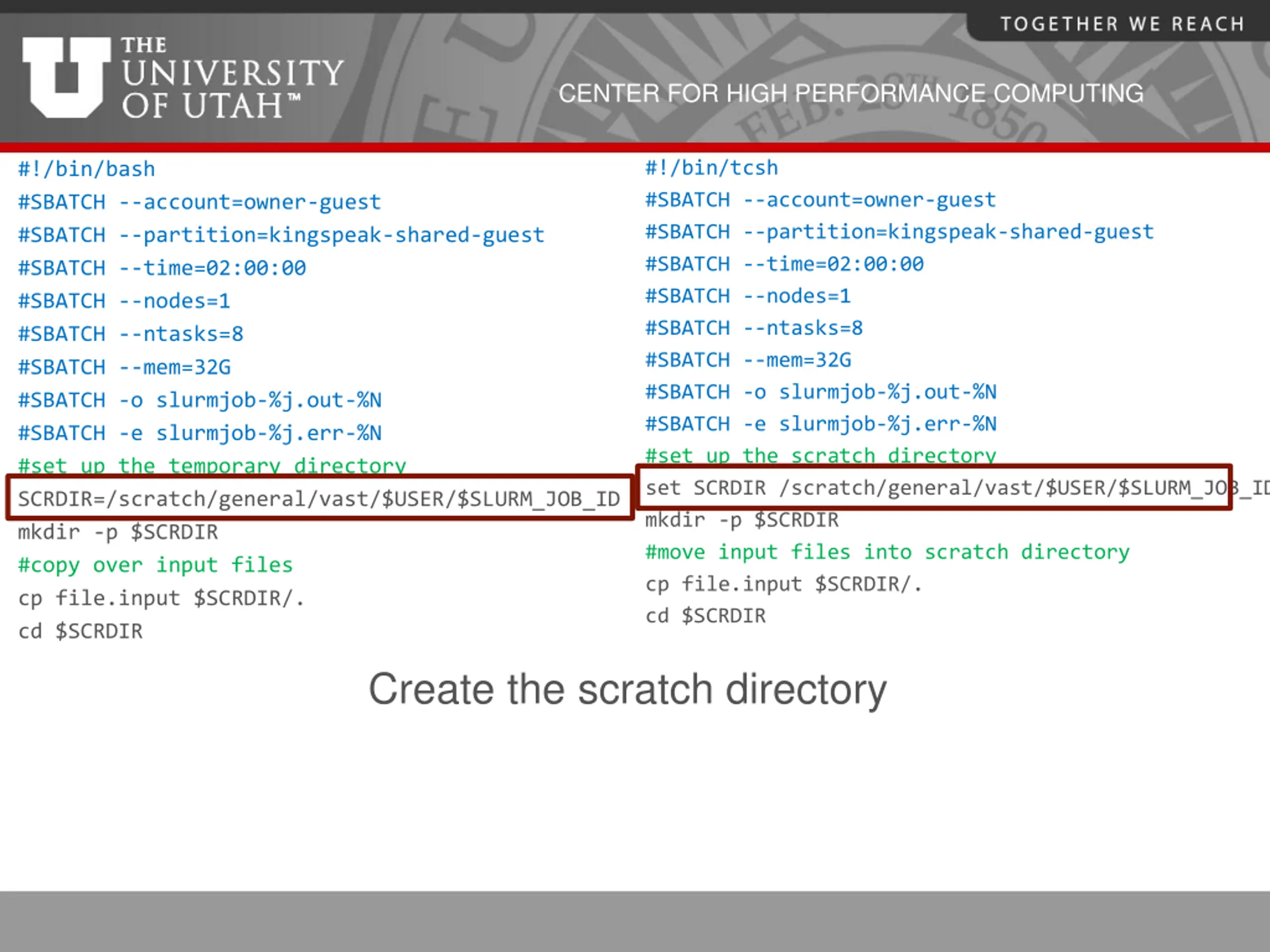 CENTER FOR HIGH PERFORMANCE COMPUTING #!/bin/tcsh #SBATCH --account=owner-guest #SBATCH --partition=kingspeak-shared-guest #SBATCH --time=02:00:00 #SBATCH --nodes=1 #SBATCH --ntasks=8 #SBATCH --mem=32G #SBATCH -o slurmjob-%j.out-%N #SBATCH -e slurmjob-%j.err-%N #set up the scratch directory set SCRDIR /scratch/general/vast/$USER/$SLURM_JOB_ID mkdir -p $SCRDIR #move input files into scratch directory cp file.input $SCRDIR/. cd $SCRDIR #!/bin/bash #SBATCH --account=owner-guest #SBATCH --partition=kingspeak-shared-guest #SBATCH --time=02:00:00 #SBATCH --nodes=1 #SBATCH --ntasks=8 #SBATCH --mem=32G #SBATCH -o slurmjob-%j.out-%N #SBATCH -e slurmjob-%j.err-%N #set up the temporary directory SCRDIR=/scratch/general/vast/$USER/$SLURM_JOB_ID mkdir -p $SCRDIR #copy over input files cp file.input $SCRDIR/. cd $SCRDIR Create the scratch directory