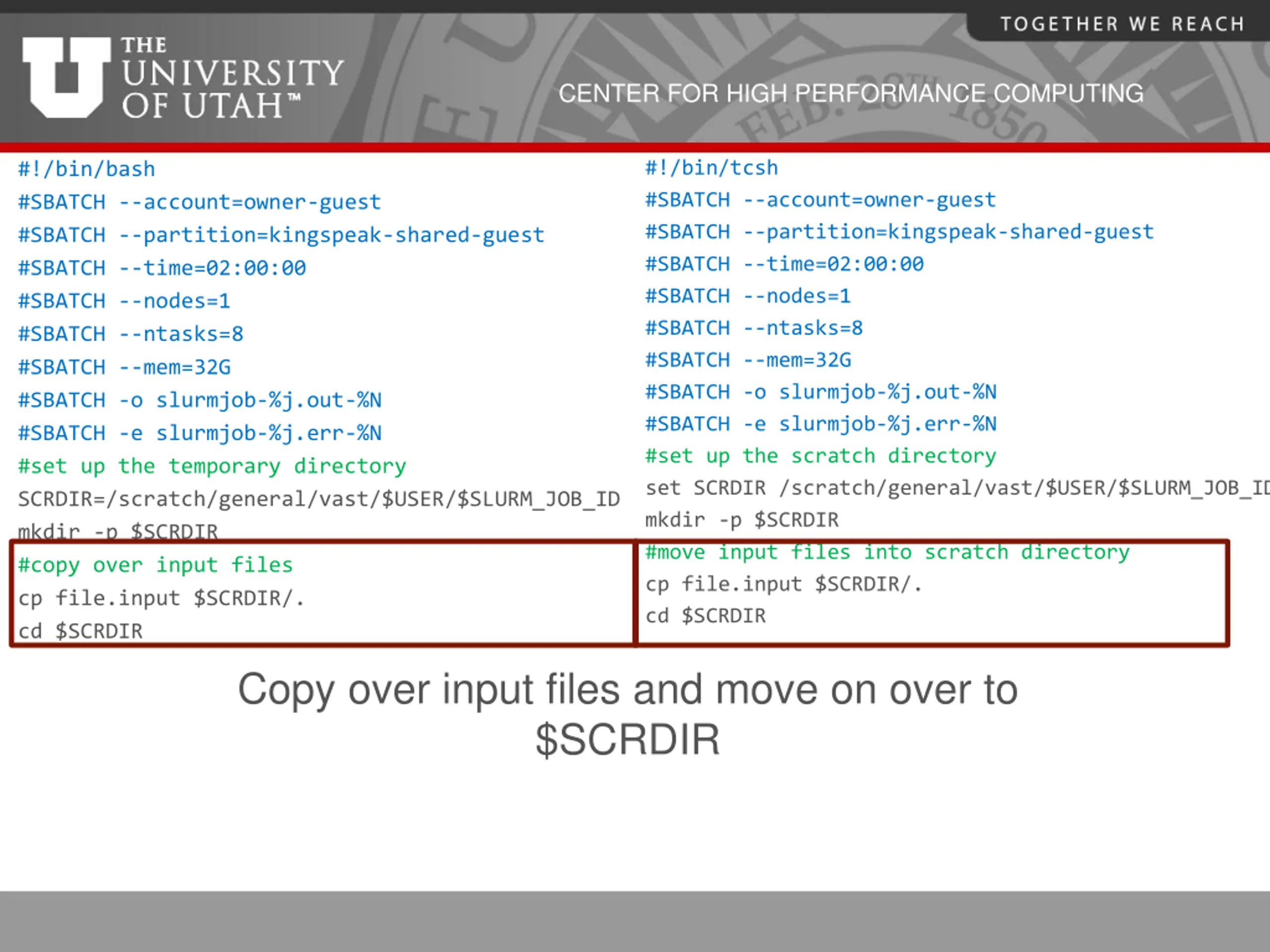 CENTER FOR HIGH PERFORMANCE COMPUTING #!/bin/tcsh #SBATCH --account=owner-guest #SBATCH --partition=kingspeak-shared-guest #SBATCH --time=02:00:00 #SBATCH --nodes=1 #SBATCH --ntasks=8 #SBATCH --mem=32G #SBATCH -o slurmjob-%j.out-%N #SBATCH -e slurmjob-%j.err-%N #set up the scratch directory set SCRDIR /scratch/general/vast/$USER/$SLURM_JOB_ID mkdir -p $SCRDIR #move input files into scratch directory cp file.input $SCRDIR/. cd $SCRDIR #!/bin/bash #SBATCH --account=owner-guest #SBATCH --partition=kingspeak-shared-guest #SBATCH --time=02:00:00 #SBATCH --nodes=1 #SBATCH --ntasks=8 #SBATCH --mem=32G #SBATCH -o slurmjob-%j.out-%N #SBATCH -e slurmjob-%j.err-%N #set up the temporary directory SCRDIR=/scratch/general/vast/$USER/$SLURM_JOB_ID mkdir -p $SCRDIR #copy over input files cp file.input $SCRDIR/. cd $SCRDIR Copy over input files and move on over to $SCRDIR