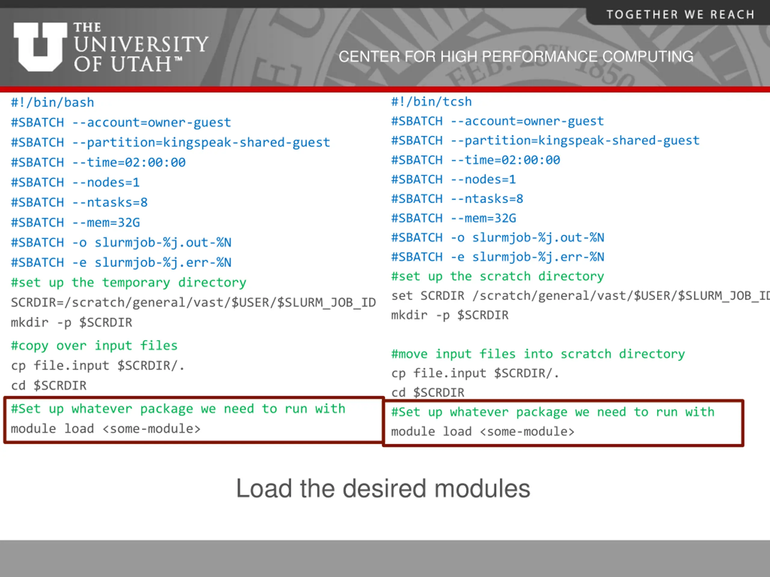 CENTER FOR HIGH PERFORMANCE COMPUTING #!/bin/tcsh #SBATCH --account=owner-guest #SBATCH --partition=kingspeak-shared-guest #SBATCH --time=02:00:00 #SBATCH --nodes=1 #SBATCH --ntasks=8 #SBATCH --mem=32G #SBATCH -o slurmjob-%j.out-%N #SBATCH -e slurmjob-%j.err-%N #set up the scratch directory set SCRDIR /scratch/general/vast/$USER/$SLURM_JOB_ID mkdir -p $SCRDIR #!/bin/bash #SBATCH --account=owner-guest #SBATCH --partition=kingspeak-shared-guest #SBATCH --time=02:00:00 #SBATCH --nodes=1 #SBATCH --ntasks=8 #SBATCH --mem=32G #SBATCH -o slurmjob-%j.out-%N #SBATCH -e slurmjob-%j.err-%N #set up the temporary directory SCRDIR=/scratch/general/vast/$USER/$SLURM_JOB_ID mkdir -p $SCRDIR #copy over input files cp file.input $SCRDIR/. cd $SCRDIR #move input files into scratch directory cp file.input $SCRDIR/. cd $SCRDIR #Set up whatever package we need to run with module load <some-module> #Set up whatever package we need to run with module load <some-module> Load the desired modules