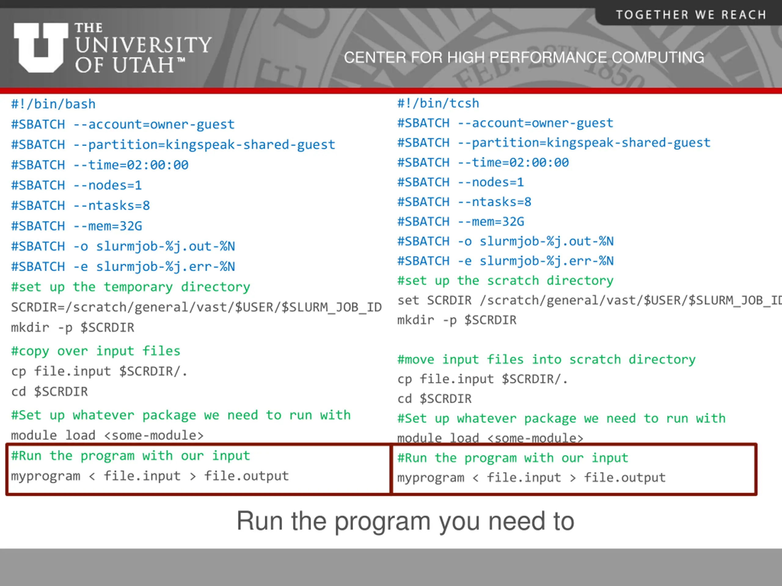 CENTER FOR HIGH PERFORMANCE COMPUTING #!/bin/tcsh #SBATCH --account=owner-guest #SBATCH --partition=kingspeak-shared-guest #SBATCH --time=02:00:00 #SBATCH --nodes=1 #SBATCH --ntasks=8 #SBATCH --mem=32G #SBATCH -o slurmjob-%j.out-%N #SBATCH -e slurmjob-%j.err-%N #set up the scratch directory set SCRDIR /scratch/general/vast/$USER/$SLURM_JOB_ID mkdir -p $SCRDIR #!/bin/bash #SBATCH --account=owner-guest #SBATCH --partition=kingspeak-shared-guest #SBATCH --time=02:00:00 #SBATCH --nodes=1 #SBATCH --ntasks=8 #SBATCH --mem=32G #SBATCH -o slurmjob-%j.out-%N #SBATCH -e slurmjob-%j.err-%N #set up the temporary directory SCRDIR=/scratch/general/vast/$USER/$SLURM_JOB_ID mkdir -p $SCRDIR #copy over input files cp file.input $SCRDIR/. cd $SCRDIR #move input files into scratch directory cp file.input $SCRDIR/. cd $SCRDIR #Set up whatever package we need to run with module load <some-module> #Run the program with our input myprogram < file.input > file.output #Set up whatever package we need to run with module load <some-module> #Run the program with our input myprogram < file.input > file.output Run the program you need to