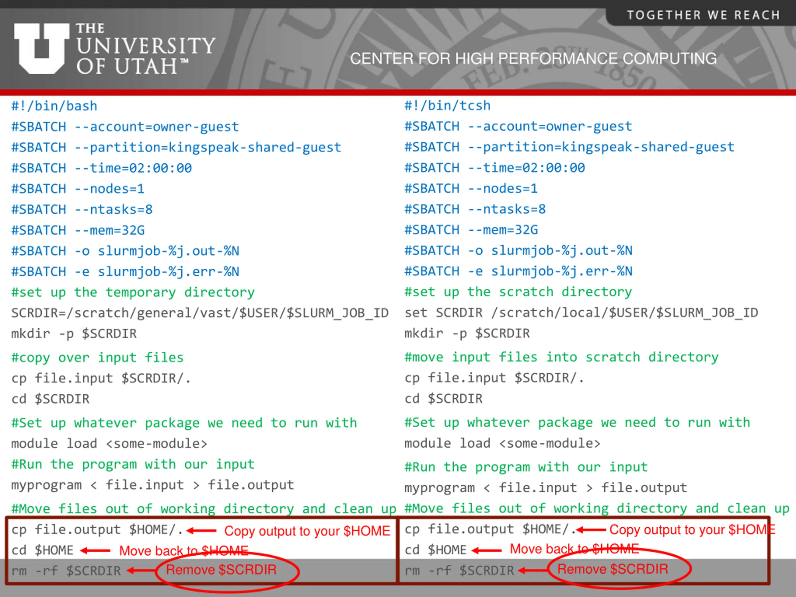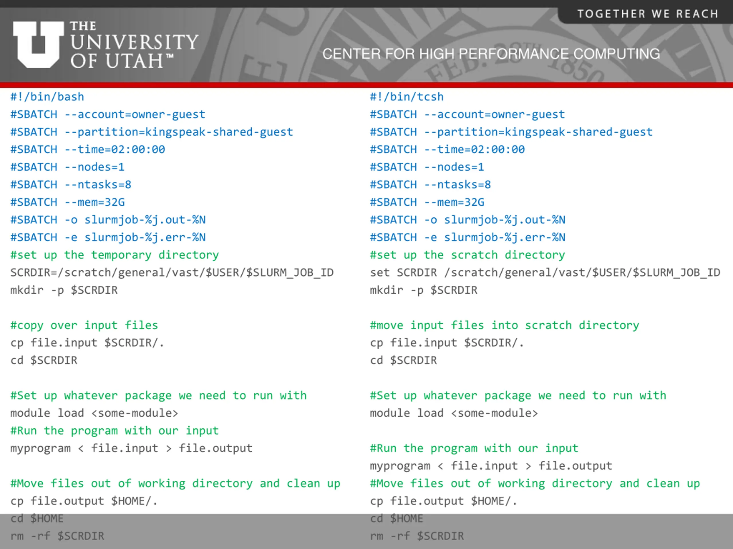 CENTER FOR HIGH PERFORMANCE COMPUTING #!/bin/bash #SBATCH --account=owner-guest #SBATCH --partition=kingspeak-shared-guest #SBATCH --time=02:00:00 #SBATCH --nodes=1 #SBATCH --ntasks=8 #SBATCH --mem=32G #SBATCH -o slurmjob-%j.out-%N #SBATCH -e slurmjob-%j.err-%N #set up the temporary directory SCRDIR=/scratch/general/vast/$USER/$SLURM_JOB_ID mkdir -p $SCRDIR #!/bin/tcsh #SBATCH --account=owner-guest #SBATCH --partition=kingspeak-shared-guest #SBATCH --time=02:00:00 #SBATCH --nodes=1 #SBATCH --ntasks=8 #SBATCH --mem=32G #SBATCH -o slurmjob-%j.out-%N #SBATCH -e slurmjob-%j.err-%N #set up the scratch directory set SCRDIR /scratch/general/vast/$USER/$SLURM_JOB_ID mkdir -p $SCRDIR #copy over input files cp file.input $SCRDIR/. cd $SCRDIR #move input files into scratch directory cp file.input $SCRDIR/. cd $SCRDIR #Set up whatever package we need to run with module load <some-module> #Run the program with our input myprogram < file.input > file.output #Set up whatever package we need to run with module load <some-module> #Run the program with our input myprogram < file.input > file.output #Move files out of working directory and clean up cp file.output $HOME/. cd $HOME rm -rf $SCRDIR #Move files out of working directory and clean up cp file.output $HOME/. cd $HOME rm -rf $SCRDIR