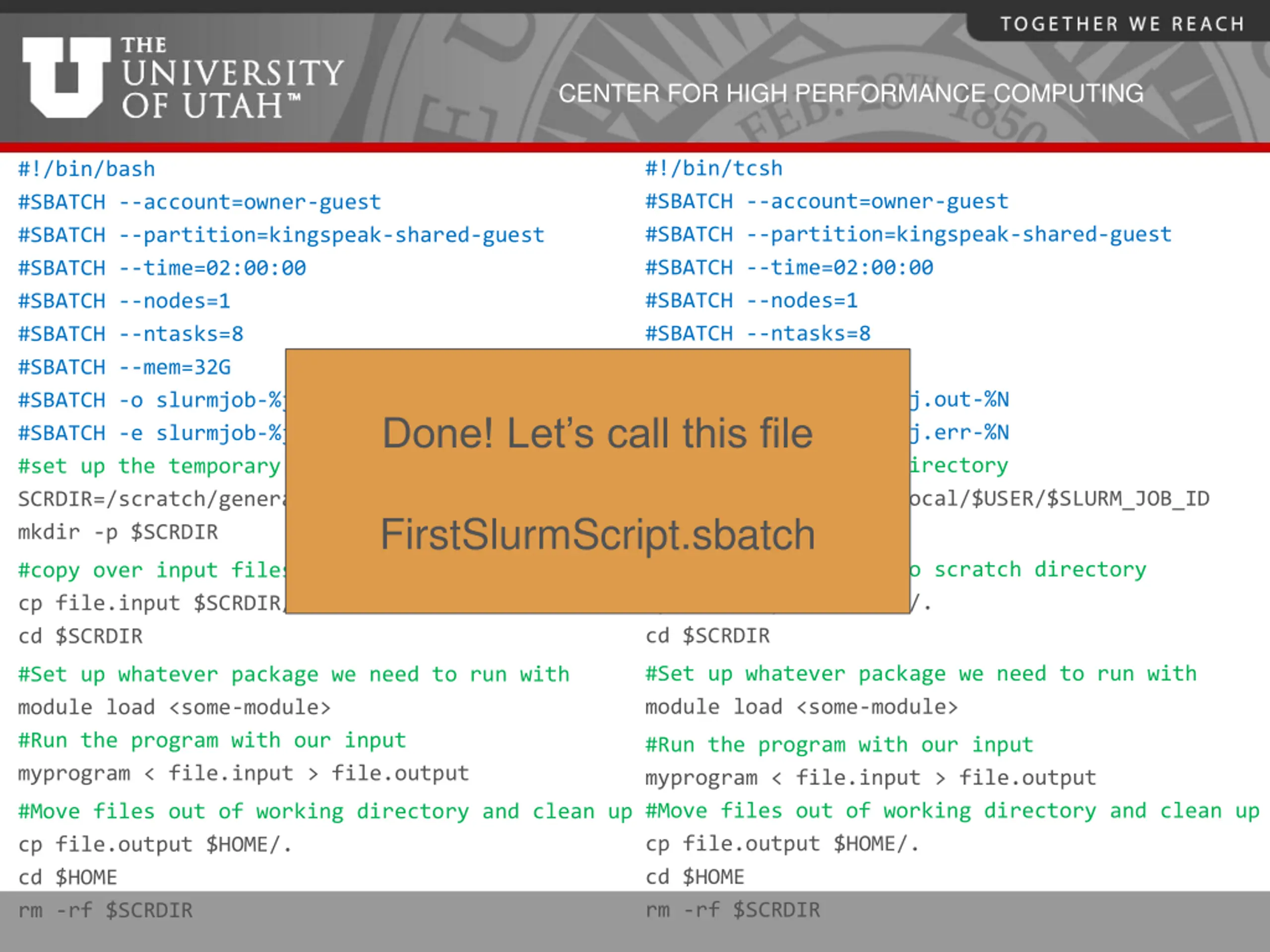CENTER FOR HIGH PERFORMANCE COMPUTING #!/bin/tcsh #SBATCH --account=owner-guest #SBATCH --partition=kingspeak-shared-guest #SBATCH --time=02:00:00 #SBATCH --nodes=1 #SBATCH --ntasks=8 #SBATCH --mem=32G #SBATCH -o slurmjob-%j.out-%N #SBATCH -e slurmjob-%j.err-%N #set up the scratch directory set SCRDIR /scratch/local/$USER/$SLURM_JOB_ID mkdir -p $SCRDIR FirstSlurmScript.sbatch #!/bin/bash #SBATCH --account=owner-guest #SBATCH --partition=kingspeak-shared-guest #SBATCH --time=02:00:00 #SBATCH --nodes=1 #SBATCH --ntasks=8 #SBATCH --mem=32G #SBATCH -o slurmjob-%j.out-%N #SBATCH -e slurmjob-%j.err-%N #set up the temporary directory SCRDIR=/scratch/general/vast/$USER/$SLURM_JOB_ID mkdir -p $SCRDIR Done! Let s call this file #move input files into scratch directory cp file.input $SCRDIR/. cd $SCRDIR #copy over input files cp file.input $SCRDIR/. cd $SCRDIR #Set up whatever package we need to run with module load <some-module> #Set up whatever package we need to run with module load <some-module> #Run the program with our input myprogram < file.input > file.output #Run the program with our input myprogram < file.input > file.output #Move files out of working directory and clean up cp file.output $HOME/. cd $HOME rm -rf $SCRDIR #Move files out of working directory and clean up cp file.output $HOME/. cd $HOME rm -rf $SCRDIR
