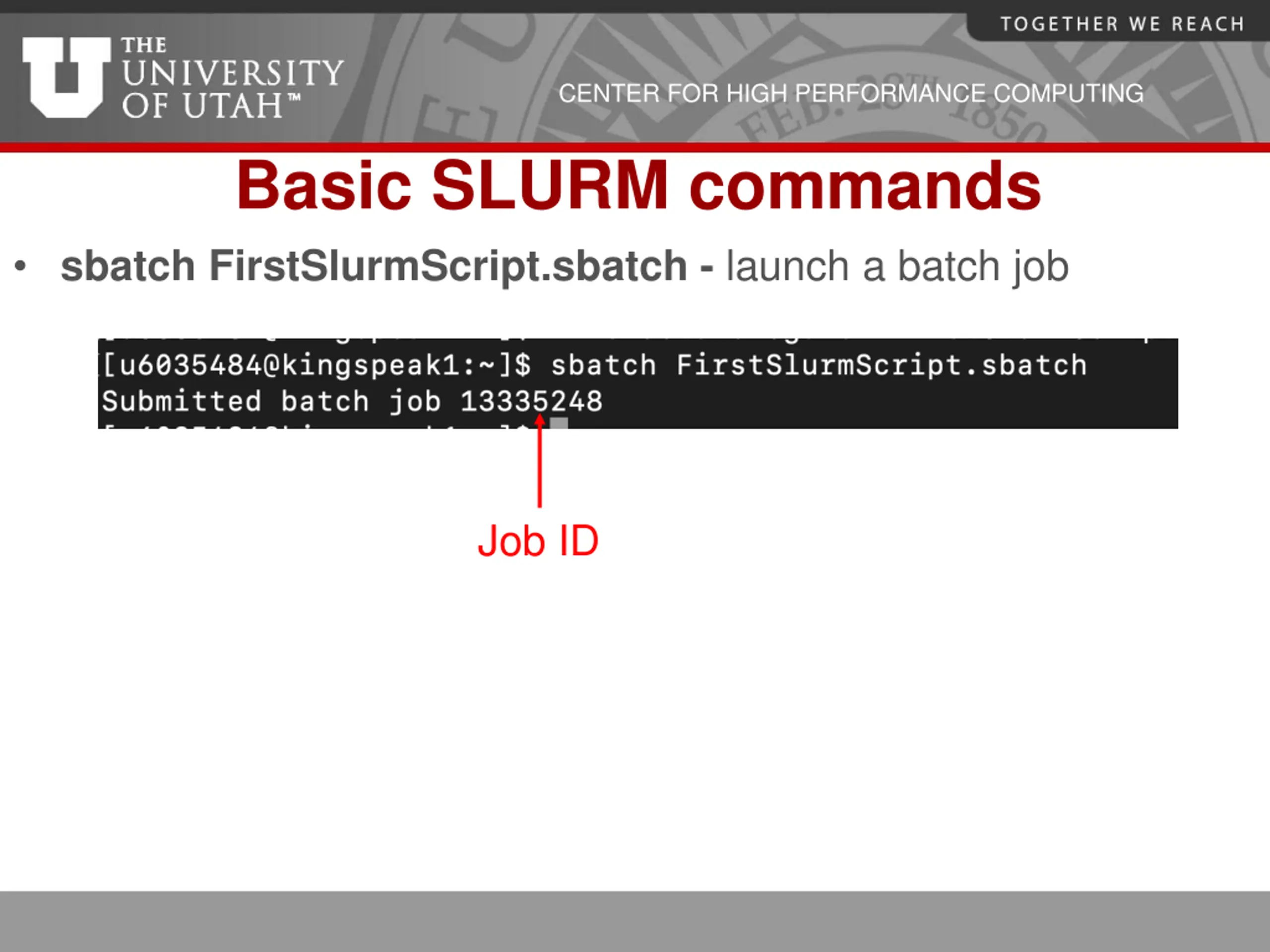 CENTER FOR HIGH PERFORMANCE COMPUTING Basic SLURM commands sbatch FirstSlurmScript.sbatch - launch a batch job Job ID