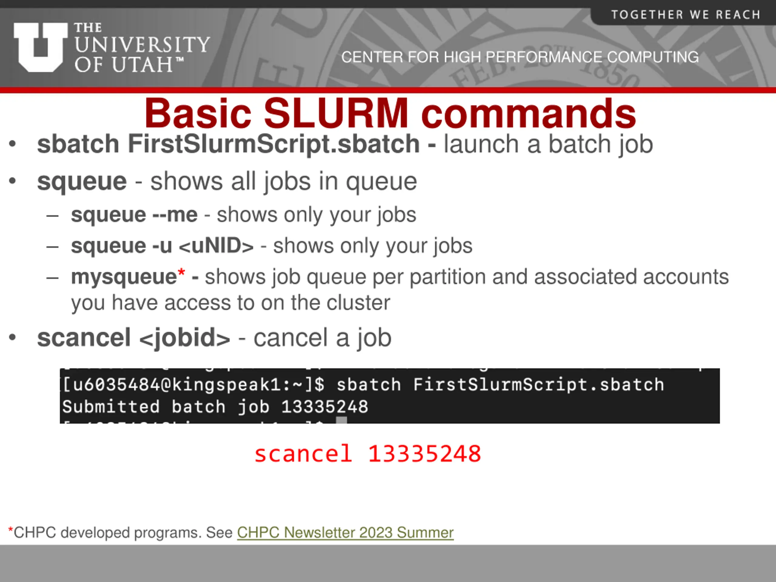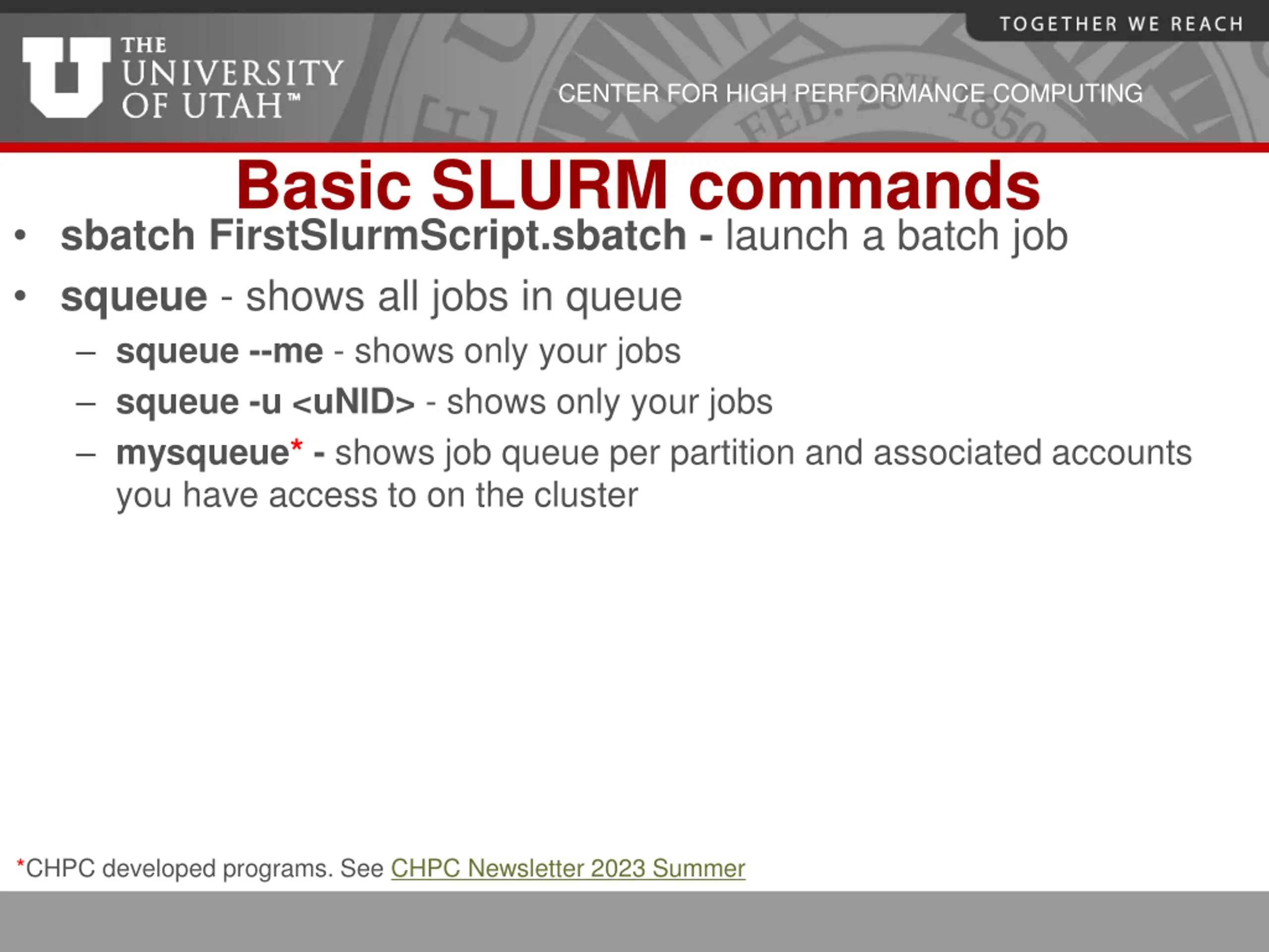 CENTER FOR HIGH PERFORMANCE COMPUTING Basic SLURM commands sbatch FirstSlurmScript.sbatch - launch a batch job squeue - shows all jobs in queue squeue --me - shows only your jobs squeue -u <uNID> - shows only your jobs mysqueue* - showsjob queue per partition and associated accounts you have access to on the cluster *CHPC developed programs. See CHPC Newsletter 2023 Summer