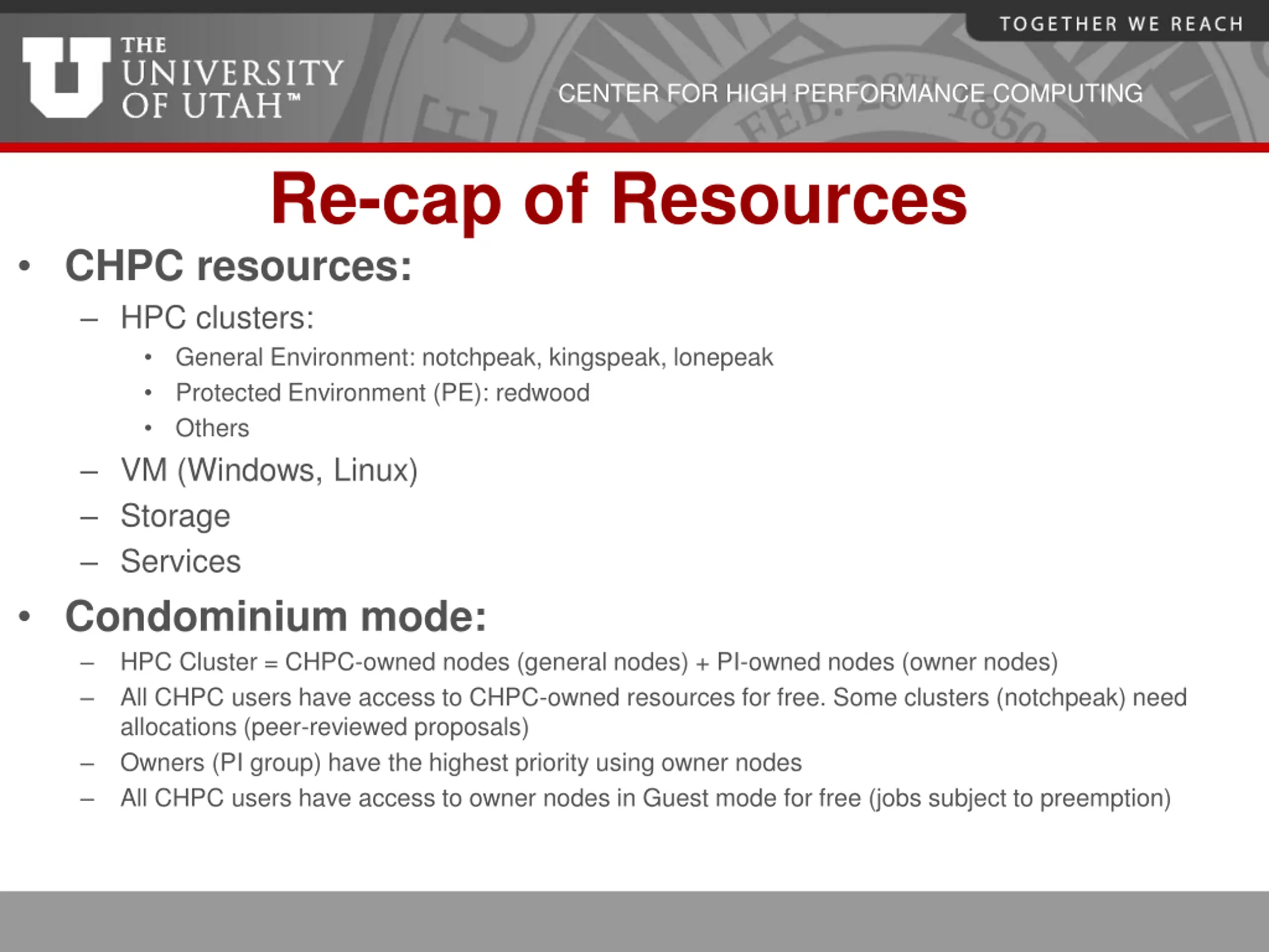 CENTER FOR HIGH PERFORMANCE COMPUTING Re-cap of Resources CHPC resources: HPC clusters: General Environment: notchpeak, kingspeak, lonepeak Protected Environment (PE): redwood Others VM (Windows, Linux) Storage Services Condominium mode: HPC Cluster = CHPC-owned nodes (general nodes) + PI-owned nodes (owner nodes) All CHPC users have access to CHPC-owned resources for free. Some clusters (notchpeak) need allocations (peer-reviewed proposals) Owners (PI group) have the highest priority using owner nodes All CHPC users have access to owner nodes in Guest mode for free (jobs subject to preemption)