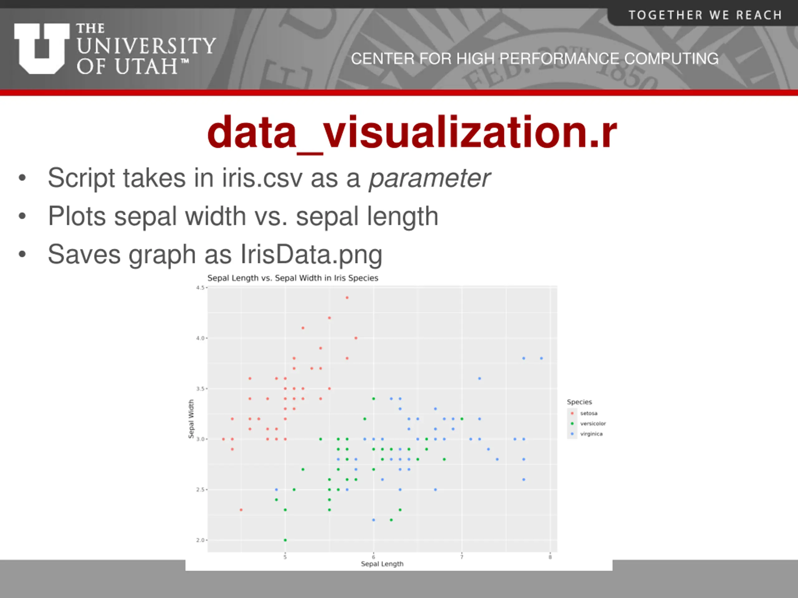 CENTER FOR HIGH PERFORMANCE COMPUTING data_visualization.r Script takes in iris.csv as a parameter Plots sepal width vs. sepal length Saves graph as IrisData.png