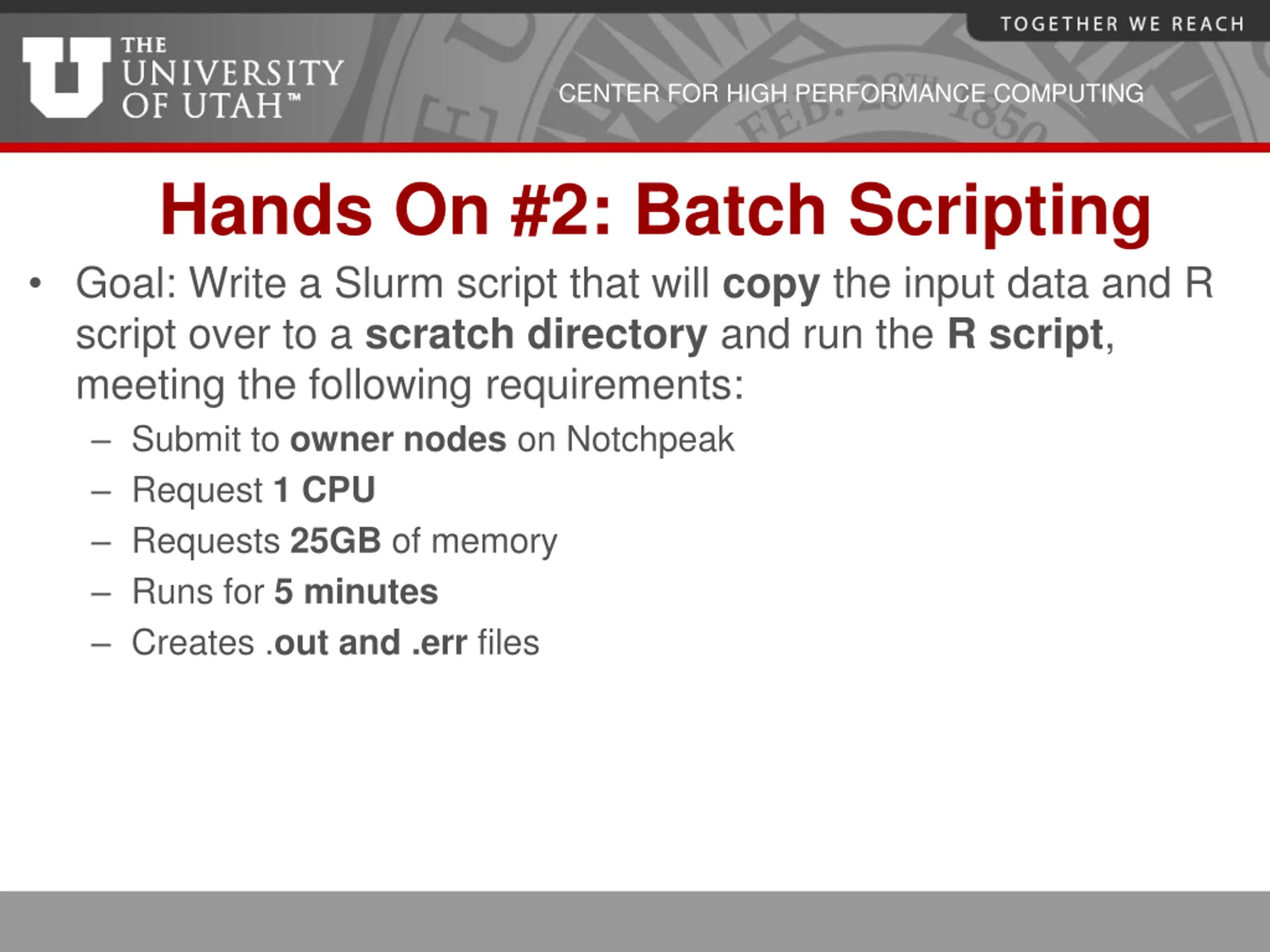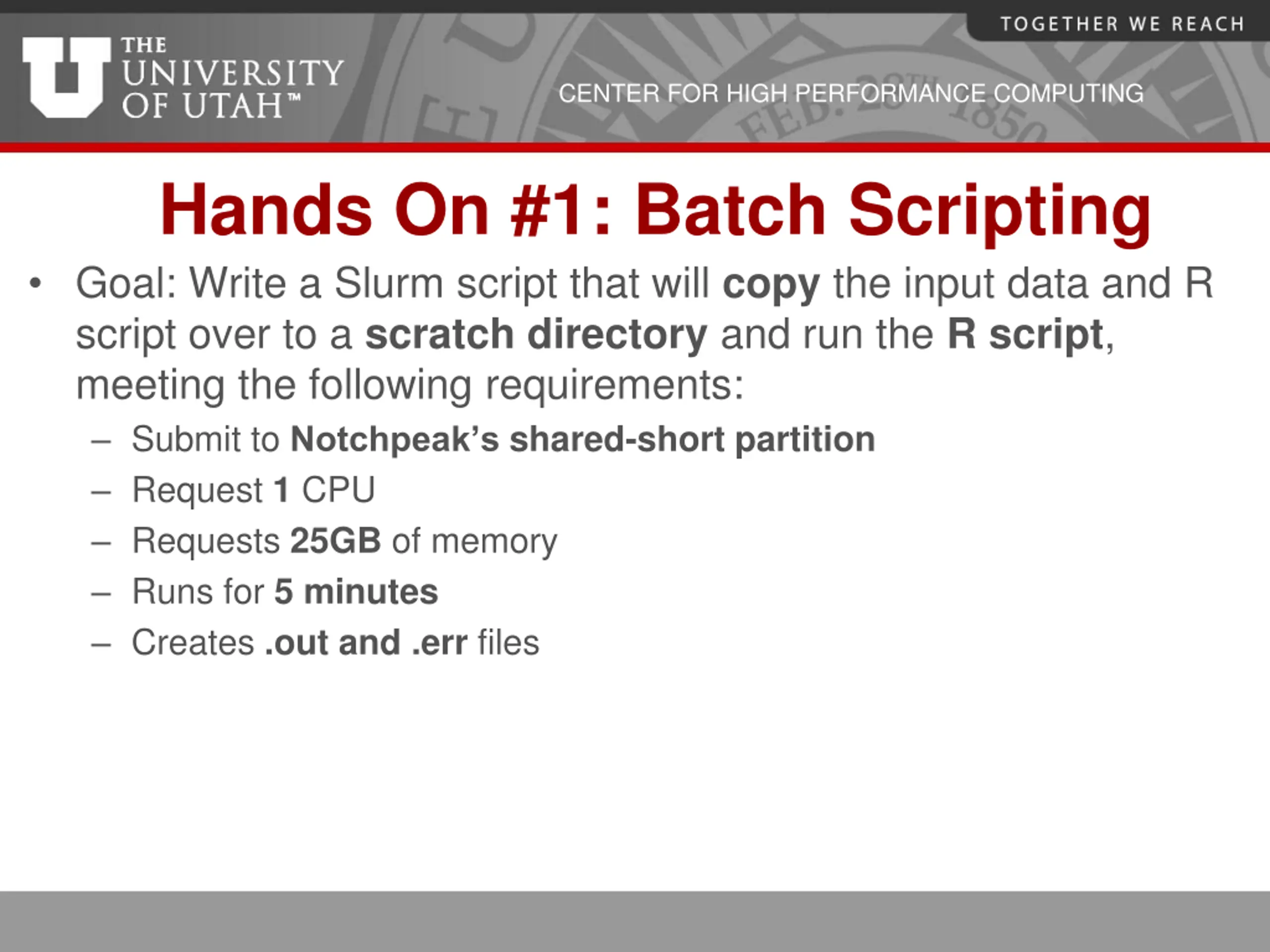 CENTER FOR HIGH PERFORMANCE COMPUTING Hands On #1: Batch Scripting Goal: Write a Slurm script that will copy the input data and R script over to a scratch directory and run the R script, meeting the following requirements: Submit to Notchpeak s shared-short partition Request 1 CPU Requests 25GB of memory Runs for 5 minutes Creates .out and .err files