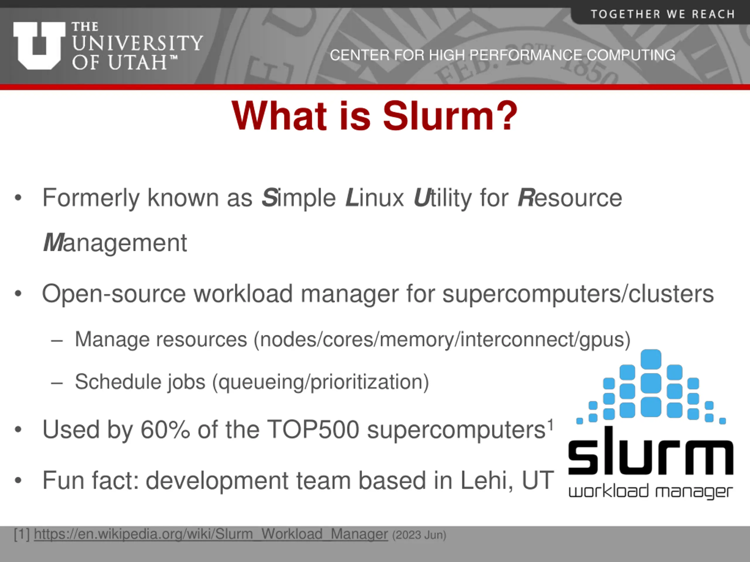 CENTER FOR HIGH PERFORMANCE COMPUTING What is Slurm? Formerly known as Simple Linux Utility for Resource Management Open-source workload manager for supercomputers/clusters Manage resources (nodes/cores/memory/interconnect/gpus) Schedule jobs (queueing/prioritization) Used by 60% of the TOP500 supercomputers1 Fun fact: development team based in Lehi, UT [1] https://en.wikipedia.org/wiki/Slurm_Workload_Manager (2023 Jun)