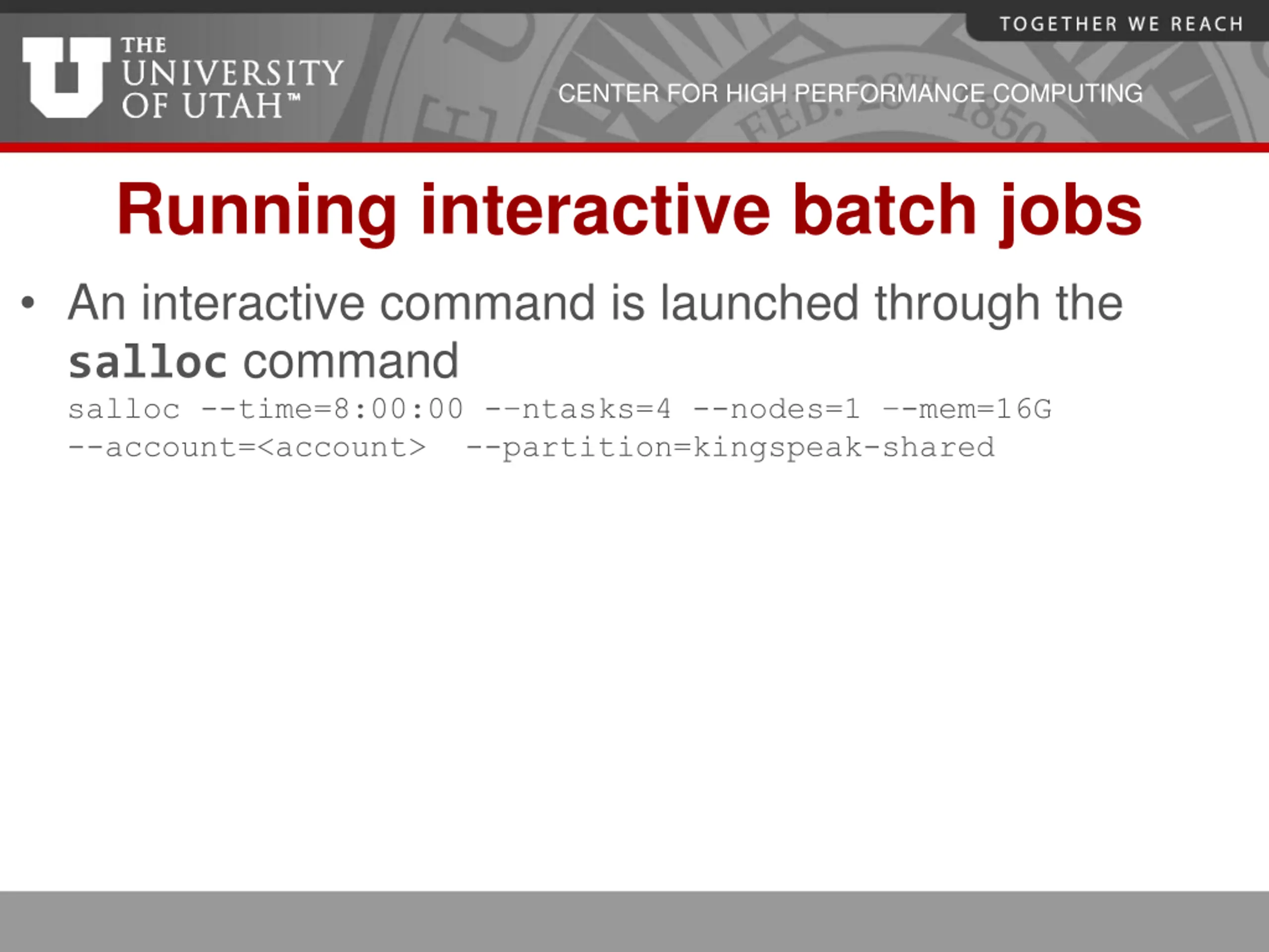 CENTER FOR HIGH PERFORMANCE COMPUTING Running interactive batch jobs An interactive command is launched through the salloc command salloc --time=8:00:00 - ntasks=4 --nodes=1 -mem=16G --account=<account> --partition=kingspeak-shared