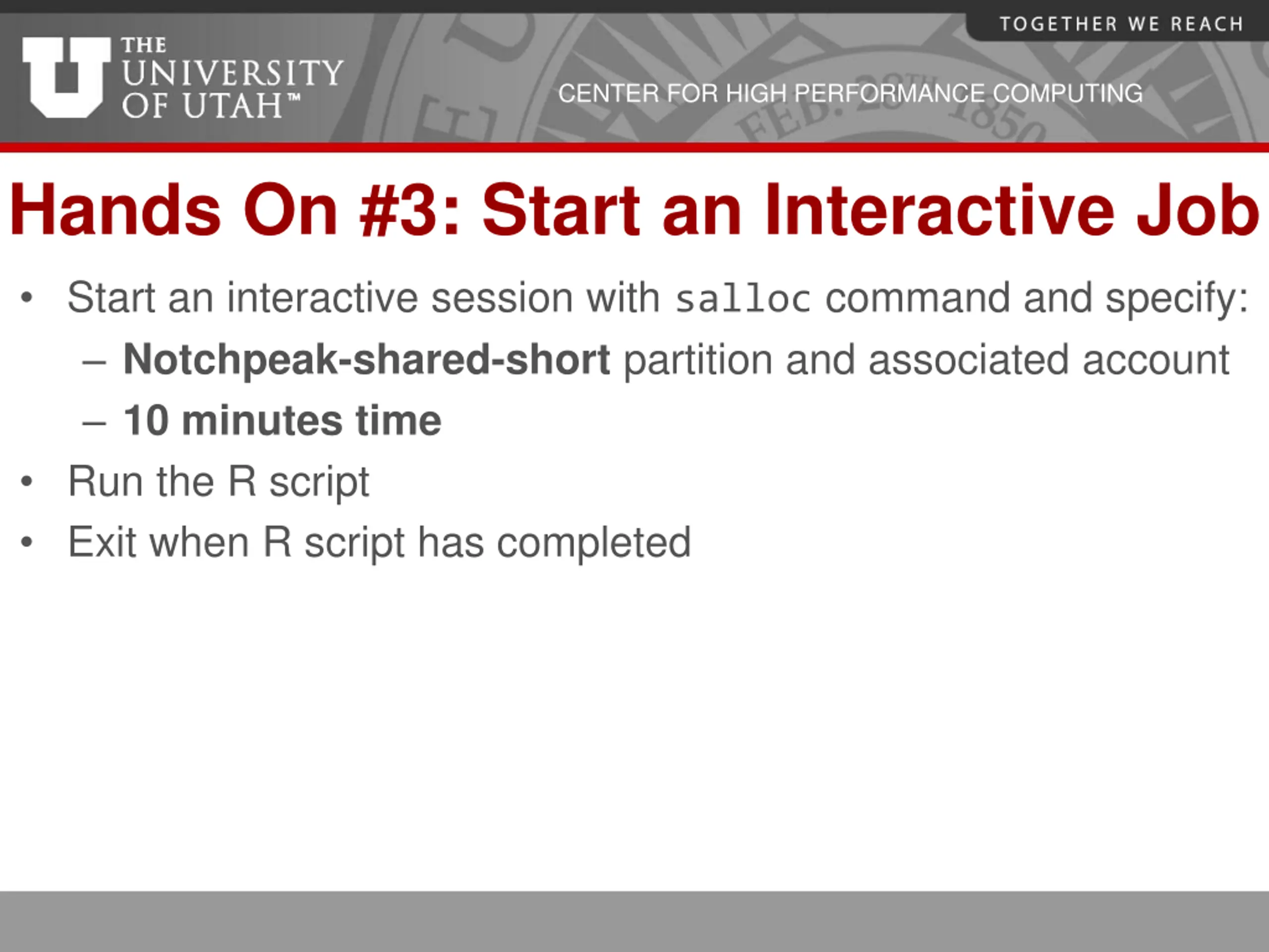 CENTER FOR HIGH PERFORMANCE COMPUTING Hands On #3: Start an Interactive Job Start an interactive session with salloc command and specify: Notchpeak-shared-short partition and associated account 10 minutes time Run the R script Exit when R script has completed