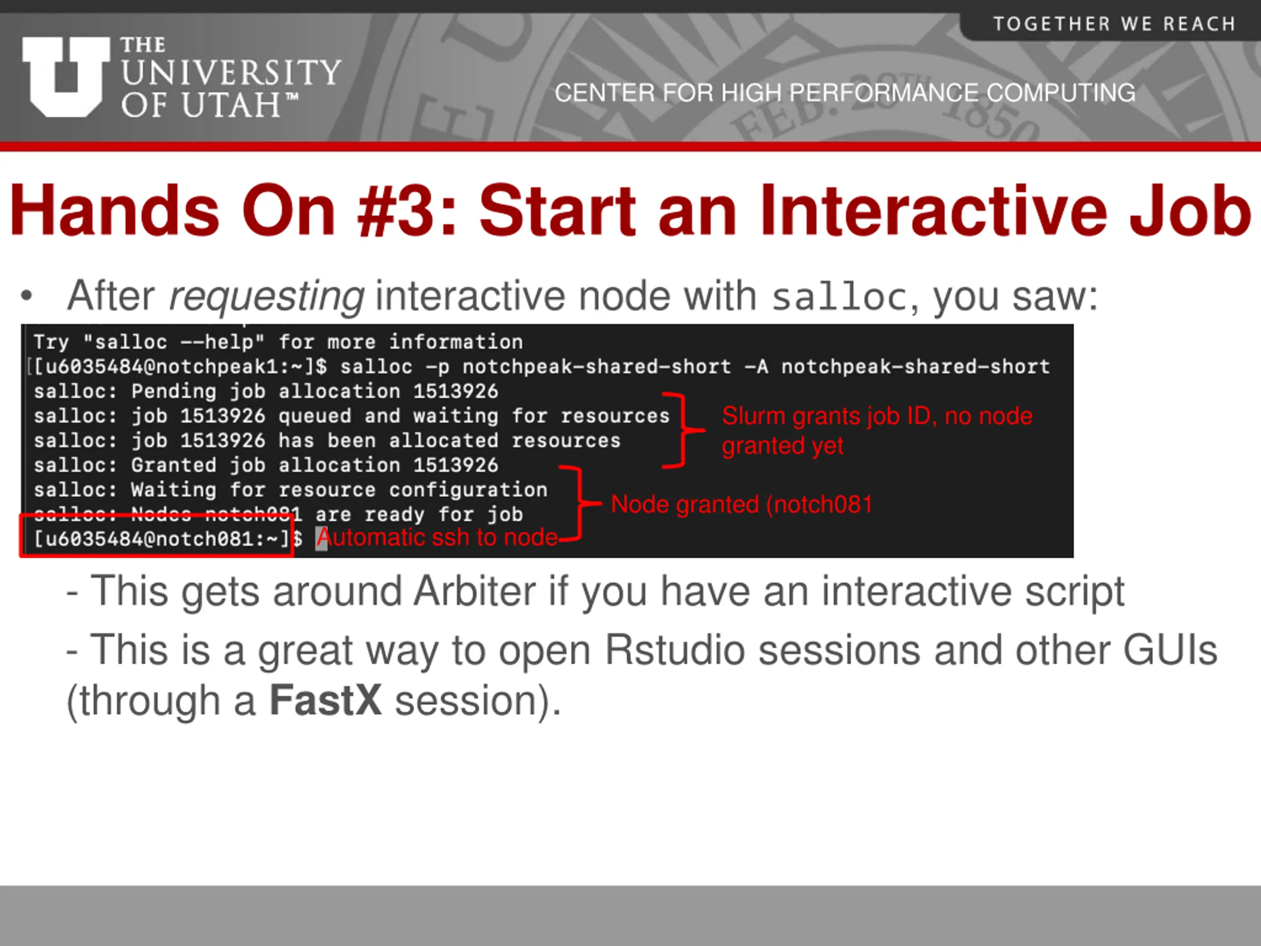CENTER FOR HIGH PERFORMANCE COMPUTING Hands On #3: Start an Interactive Job After requesting interactive node with salloc, you saw: Slurm grants job ID, no node granted yet Node granted (notch081 Automatic ssh to node - This gets around Arbiter if you have an interactive script - This is a great way to open Rstudio sessions and other GUIs (through a FastX session).